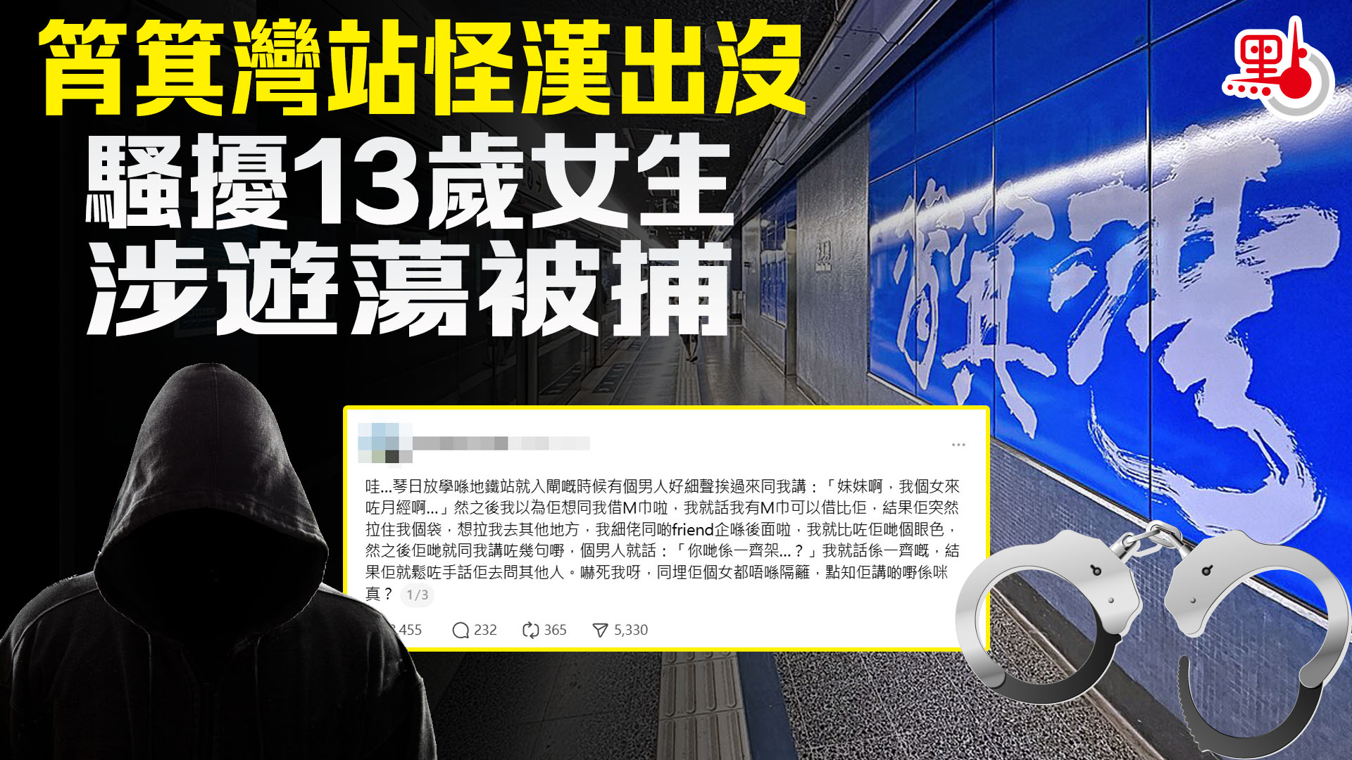 該名女學生在社交平台threads發文憶述事發經過,指3月3日下午放學後,在筲箕灣港鐵站D出口擬入閘時,一名着運動服裝的男子突走近,「好細聲挨過來同我講:『妹妹啊,我個女來咗月經啊』,然之後我以為佢想同我借M巾(衞生巾)啦,我就話我有M巾可以借畀佢,結果佢突然拉住我個袋,想拉我去其他地方」。