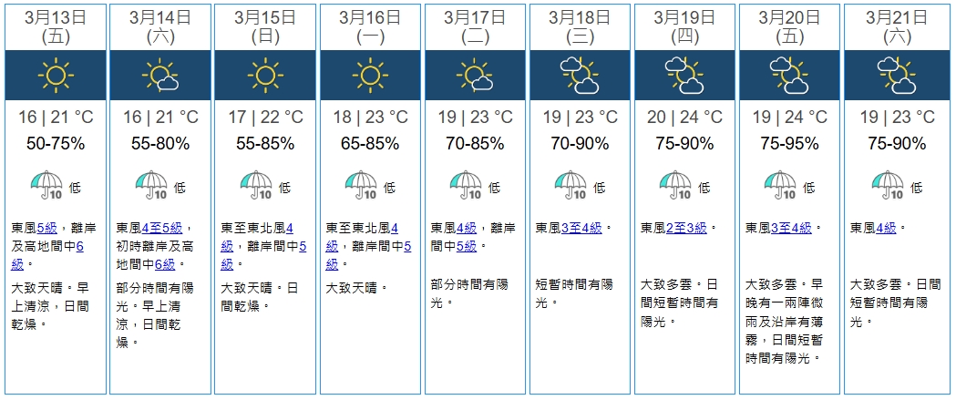 根據天文台九天天氣預報,明日周五市區最低氣溫會下降至16度,比今日最高氣溫低8度。按照「自動分區天氣預報」,明早新界多區會跌至14、15度左右,其中打鼓嶺更會跌至13度。日夜溫差頗大。