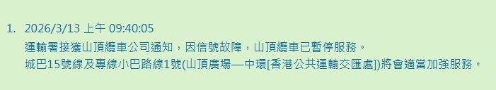 山頂纜車因信號故障暫停 運輸署:城巴15號及專線小巴1號加強服務