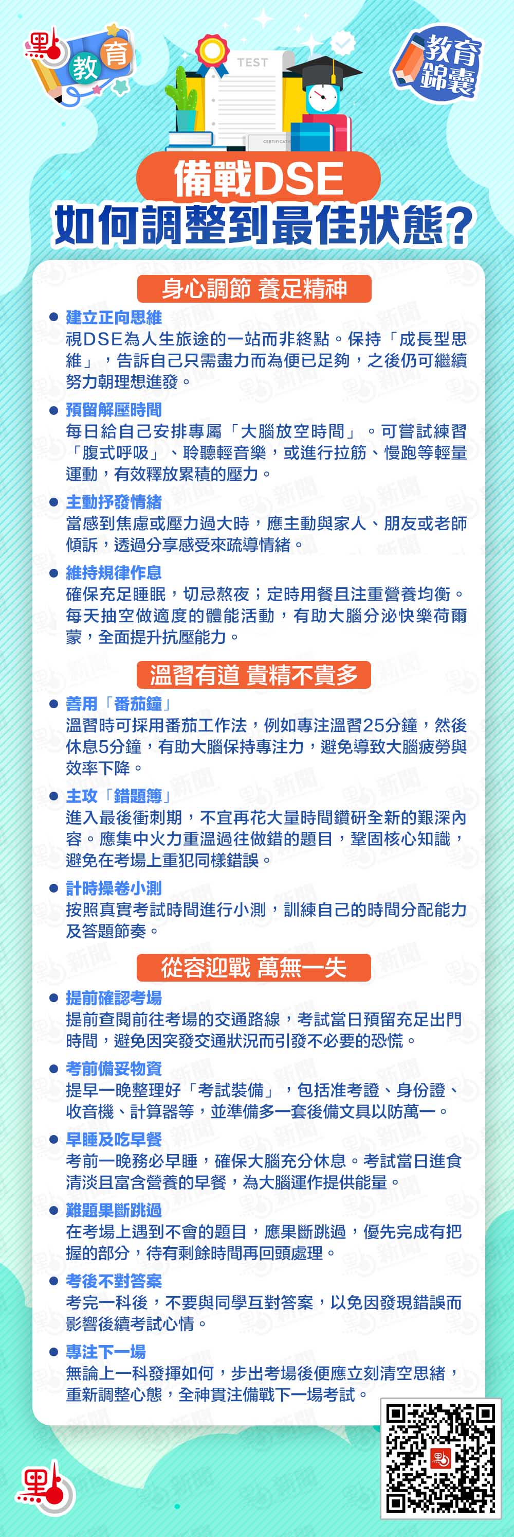 【點新聞報道】2026年香港中學文憑試英文口試已於本周二(10日)開考,筆試則於4月8日開啟。面對DSE,考生難免感到緊張不安,但良好的心態往往是保證發揮的關鍵。「點教育」特意整理備戰DSE貼士懶人包,助各位考生調整步伐,以最佳的身心狀態迎接挑戰!