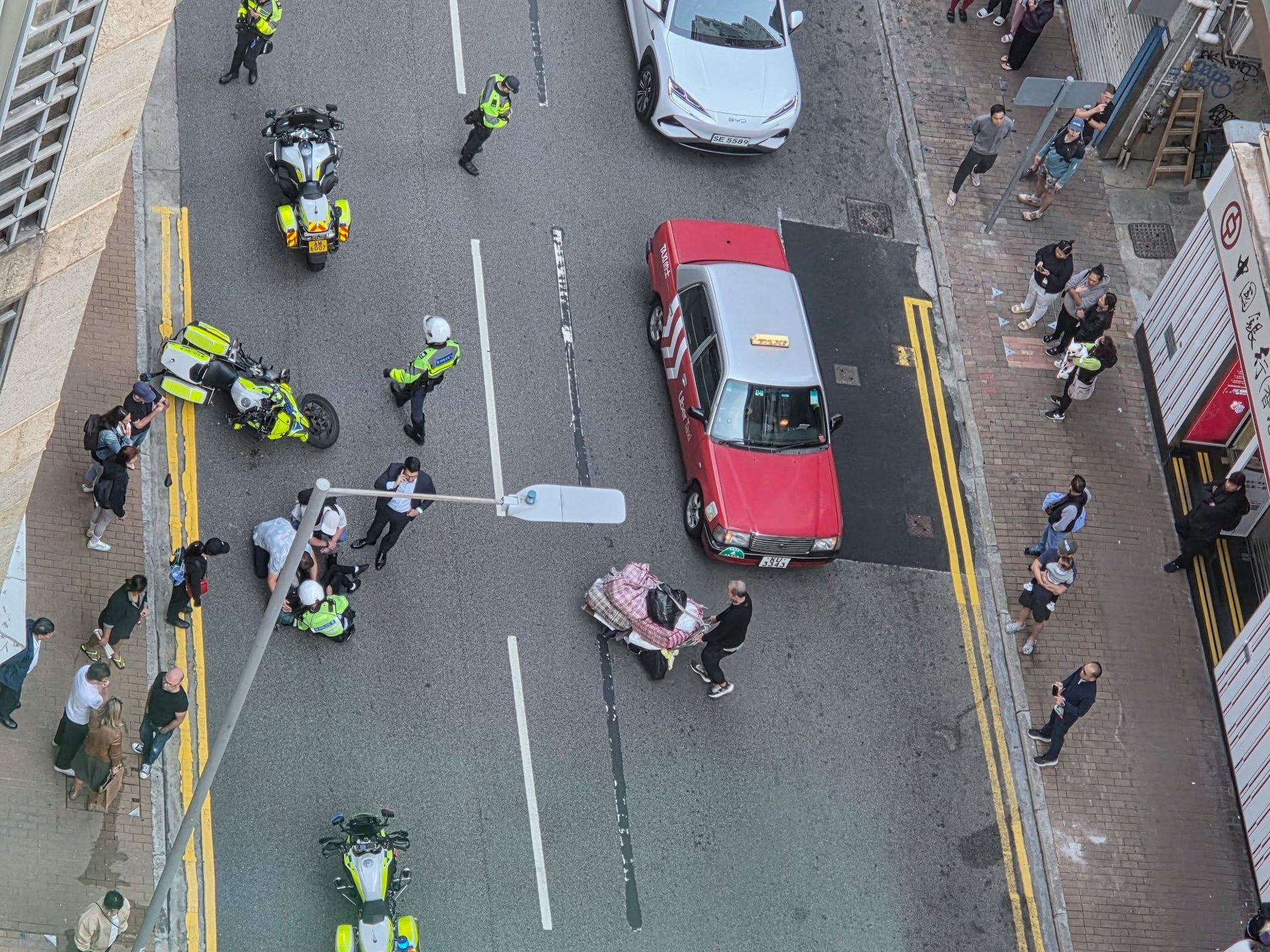 現場圖片可見,電單車翻側在路邊,警員和途人正協助倒地男童。男童手受傷清醒,涉事交通警則腳部受傷,均由救護車送往律敦治醫院治療。