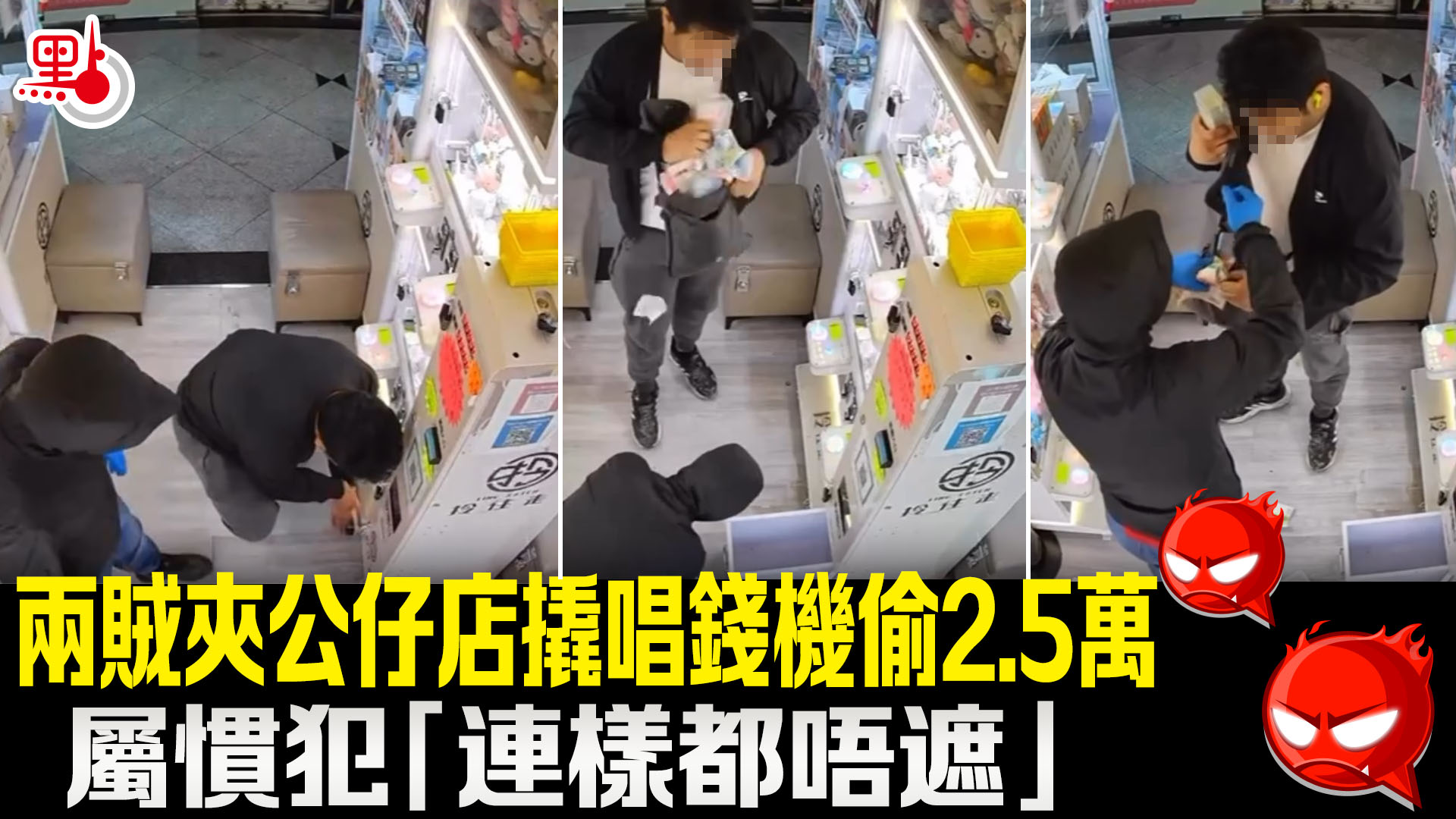 從店舖上載的閉路電視片段可見,兩名男子闖入夾公仔店,其中一人穿黑色連帽衫,戴口罩、手套作遮掩;另外一人則連樣都唔遮,肆無忌憚用士巴拿撬開唱錢機的紙幣箱。兩人然後偷去大疊現金及裝載現金的膠盒,期間因袋子不夠大,一邊偷錢一邊說「放唔到入去嘅!」,其後拆開膠盒取出現金,才將所有現金放入袋內,全程被店內的閉路電視拍下。