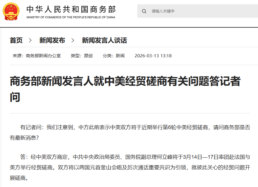 商務部發言人表示,經中美雙方商定,中共中央政治局委員、國務院副總理何立峰將於3月14日至17日率團赴法國與美方舉行經貿磋商。雙方將以兩國元首釜山會晤及歷次通話重要共識為引領,就彼此關心的經貿問題開展磋商。