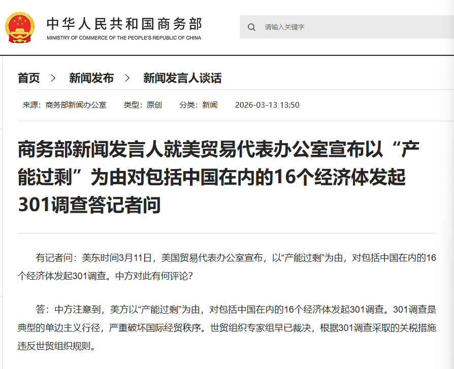 商務部新聞發言人表示,中方注意到,美方以「產能過剩」為由,對包括中國在內的16個經濟體發起301調查。301調查是典型的單邊主義行徑,嚴重破壞國際經貿秩序。世貿組織專家組早已裁決,根據301調查採取的關稅措施違反世貿組織規則。