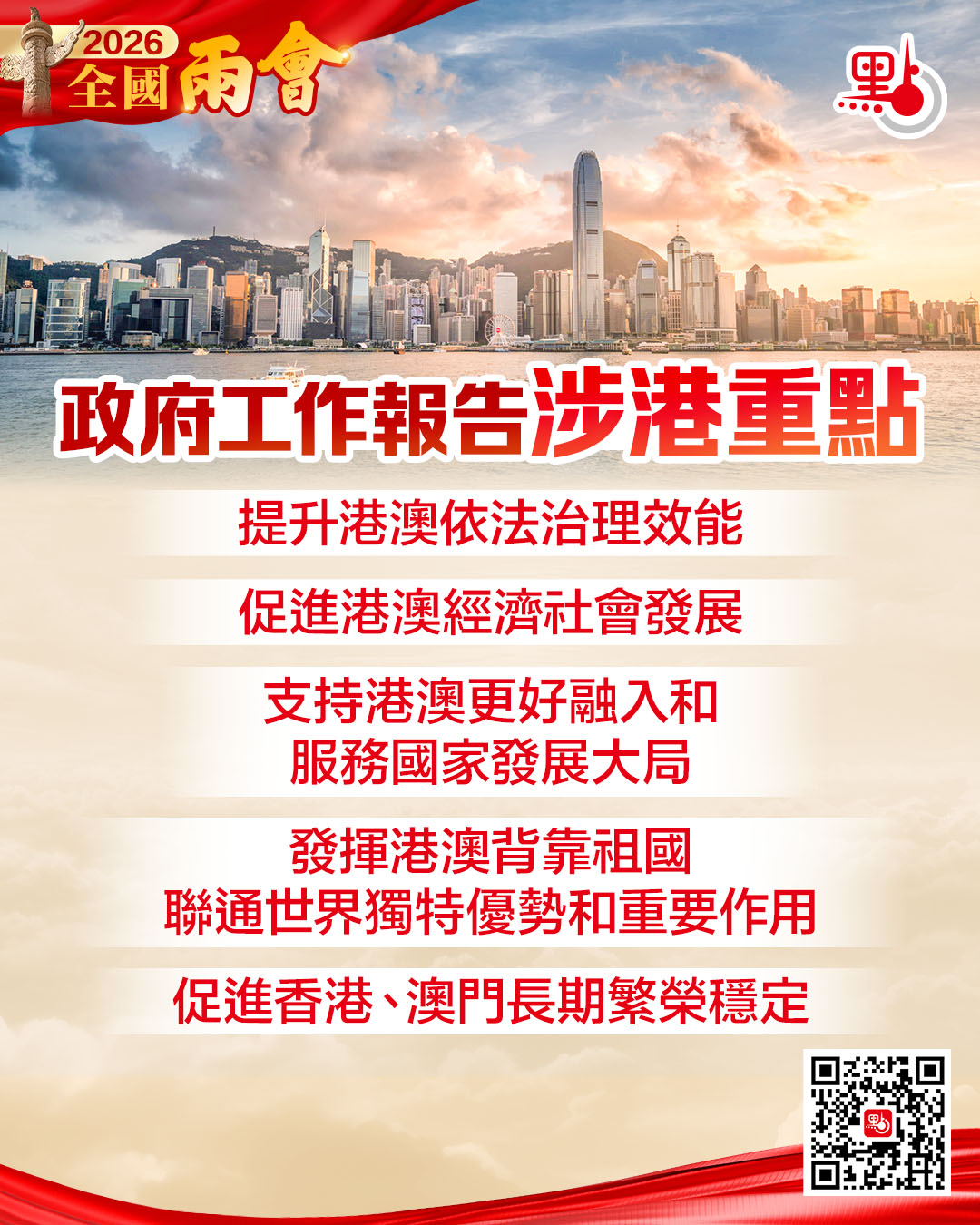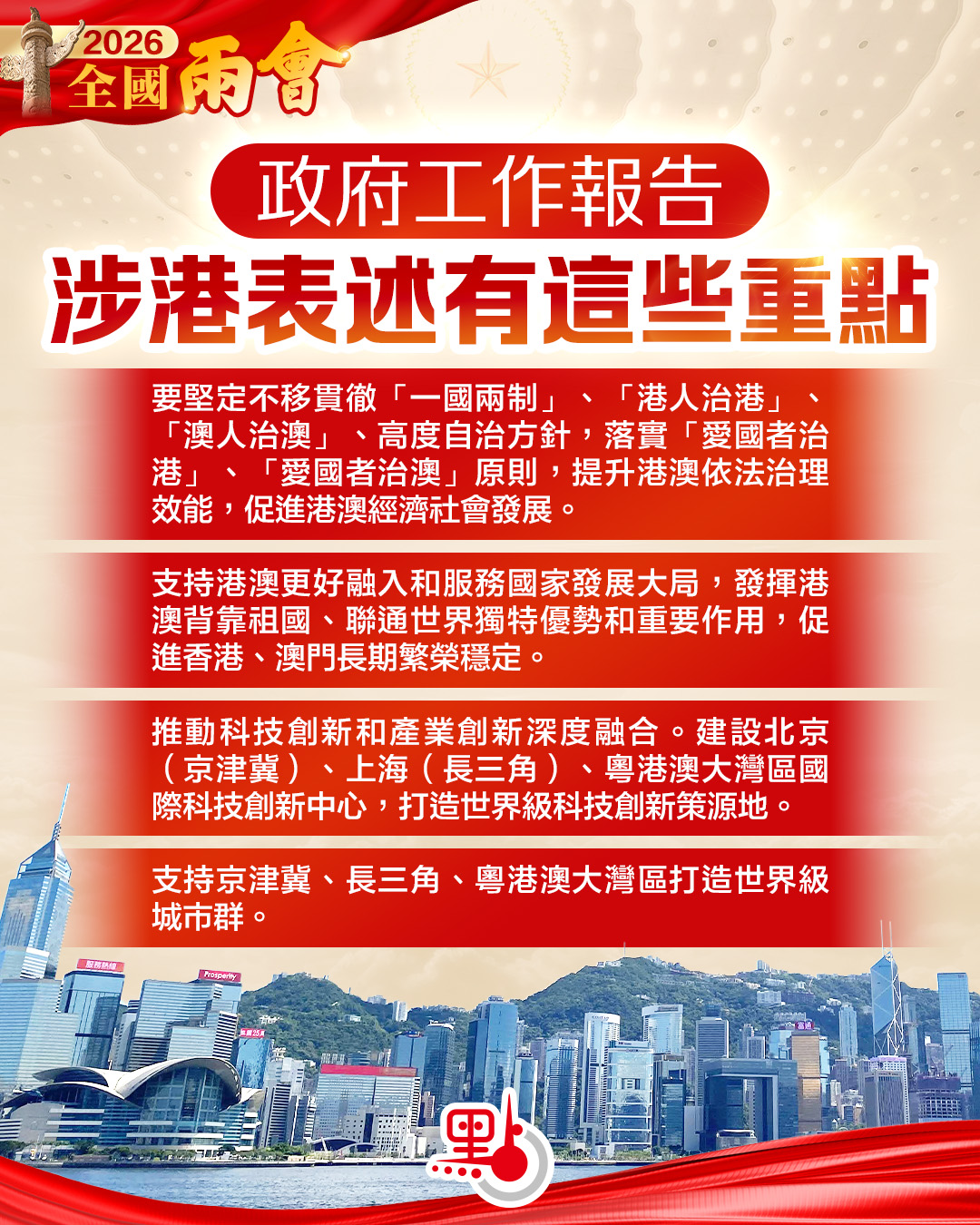我們要堅定不移貫徹「一國兩制」、「港人治港」、「澳人治澳」、高度自治方針,落實「愛國者治港」、「愛國者治澳」原則,提升港澳依法治理效能,促進港澳經濟社會發展。支持港澳更好融入和服務國家發展大局,發揮港澳背靠祖國、聯通世界獨特優勢和重要作用,促進香港、澳門長期繁榮穩定。