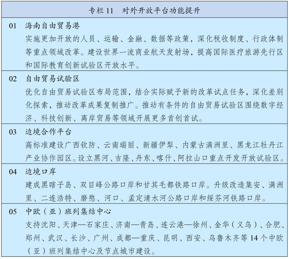 支持香港鞏固提升國際金融、航運、貿易中心和國際航空樞紐地位,強化全球離岸人民幣業務樞紐、國際資產及財富管理中心、國際風險管理中心功能,構建大宗商品交易生態圈和高增值供應鏈服務中心。支持香港建設國際創新科技中心,深化國際法律及解決爭議服務中心、區域知識產權貿易中心、中外文化藝術交流中心建設,加快北部都會區建設。支持澳門經濟適度多元發展,深化世界旅遊休閒中心、中國與葡語國家商貿合作服務平台和以中華文化為主流、多元文化共存的交流合作基地建設,提升中醫藥大健康、特色金融、高新技術、會展商貿等產業競爭力。支持港澳打造國際高端人才集聚高地。