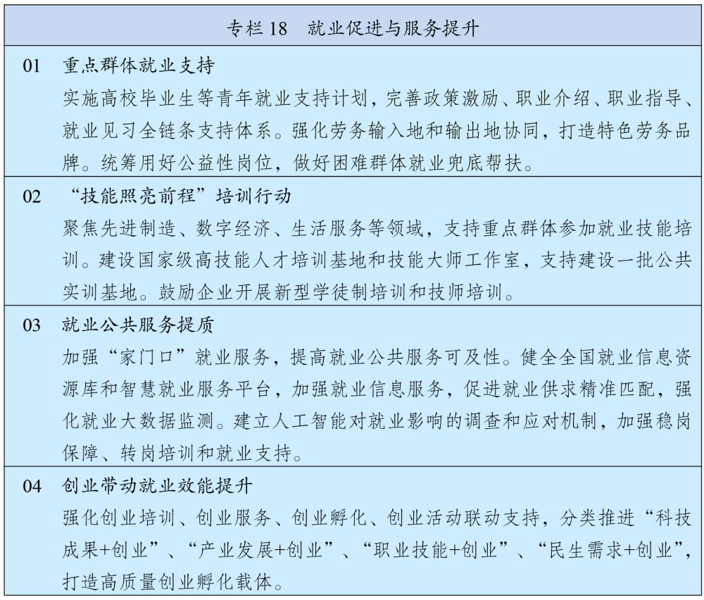綱要共分為18篇:「奮力開創中國式現代化建設新局面」「建設現代化產業體系 鞏固壯大實體經濟根基」「加快高水平科技自立自強 引領發展新質生產力」「深入推進數字中國建設 提升數智化發展水平」「建設強大國內市場 加快構建新發展格局」「加快構建高水平社會主義市場經濟體制 增強高質量發展動力」「擴大高水平對外開放 開創合作共贏新局面」「加快農業農村現代化 扎實推進鄉村全面振興」「優化區域經濟布局 促進區域協調發展」「激發全民族文化創新創造活力 繁榮發展社會主義文化」「完善人口發展戰略 促進人口高質量發展」「加大保障和改善民生力度 扎實推進全體人民共同富裕」「加快經濟社會發展全面綠色轉型 建設美麗中國」「推進國家安全體系和能力現代化 建設更高水平平安中國」「如期實現建軍一百年奮鬥目標 高質量推進國防和軍隊現代化」「發展全過程人民民主 完善中國特色社會主義法治體系」「堅持和完善『一國兩制』 推進祖國統一」「加強規劃實施保障」。