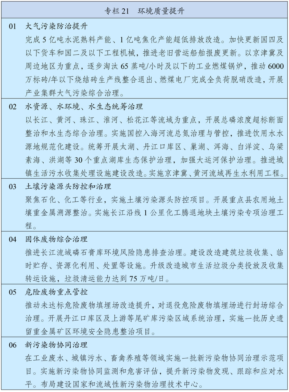 持續深入推進污染防治攻堅,以更高標準改善大氣、水、土壤環境質量。以京津冀及周邊、長三角、汾渭平原等重點區域為主戰場,強化細顆粒物(PM2.5)控制,深入推進重點行業超低排放改造,推動揮發性有機物源頭替代和全流程治理,制定下一階段機動車排放和油品質量標準,深化大氣環境績效分級管理,氮氧化物、揮發性有機物排放量分別下降8%以上,進一步消除重污染天氣。加強長江中游、成渝等區域大氣污染防治。加強餐飲油煙、惡臭異味和環境噪聲污染治理。統籌水資源、水環境、水生態治理,以解決全流域和跨省界突出問題為重點,加強重要江河湖庫系統治理和生態保護,基本完成重點流域海域入河入海排污口排查整治,化學需氧量、總磷排放量分別下降6%,鞏固城市黑臭水體治理成效、基本消除縣鄉黑臭水體。加強土壤污染源頭防控,推進受污染耕地、建設用地安全利用。