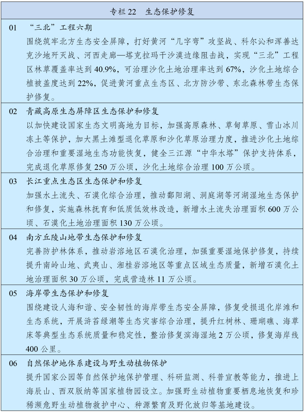 統籌推進重要生態系統保護和修復重大工程,持續鞏固以「三區四帶」為骨架的國家生態安全屏障體系。打好「三北」工程攻堅戰,推動三大標誌性戰役取得決定性勝利。深入推進青藏高原生態保護,加強重點區域水土流失治理和石漠化治理。科學開展大規模國土綠化行動,推進森林質量精準提升和國家儲備林建設,森林蓄積量達到224億立方米,統籌草原生態修復與合理利用,加強濕地保護修復。推進超引地表水和超採地下水治理,開展歷史遺留廢棄礦山生態修復。