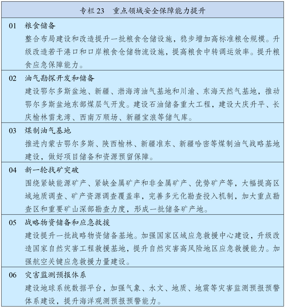 堅持立足國內、補齊短板、多元保障、強化儲備,加強能源產供儲銷體系建設。堅持油氣核心需求自主保障,實施中長期油氣增儲上產戰略行動,確保原油年產量穩定在2億噸左右、天然氣產量穩步增長,加強煤制油氣產能和技術儲備。強化政府儲備和企業儲備協同,提升國家石油儲備規模,建立更加靈活的輪換動用機制,增強天然氣儲備調節保障能力,完善煤炭儲備體系。健全能源保供中長期合同制度,完善電力應急調度機制和備用電源配置,強化能源需求側管理。加強戰略性礦產資源勘探開發和儲備,深入實施新一輪找礦突破戰略行動,統籌加強產品、產能和產地儲備,推動大宗商品儲運基地建設,提升戰略性礦產資源安全風險監測預警和應急保供水平。加強能源資源開發國際合作,維護戰略通道安全。