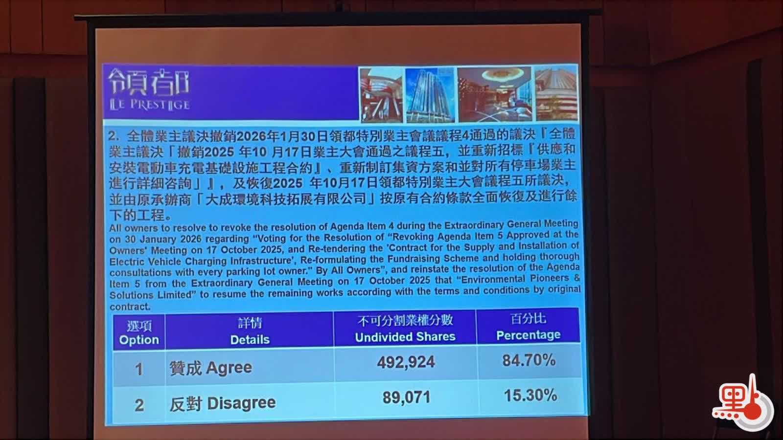 最終,在晚上近10時,大會以492924業權分數、84.7%贊成票通過決議,撤銷1月底的議決,恢復去年10月通過的工程方案。據了解,本次結果為業主大會正式表決,未來仍可能就同一議題重新投票。