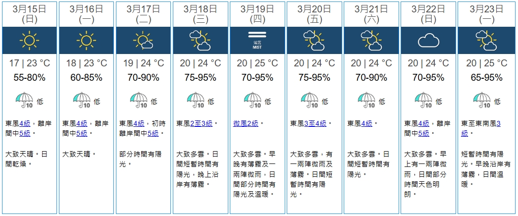 根據天文台9天天氣預測,天氣將進一步回暖,明日(15日)最低氣溫回升1度至17度,最高氣溫則有23度。下周二(17日)及下周三(18日)仍然溫暖,最高氣溫有24度,當中周三晚上沿岸有薄霧。