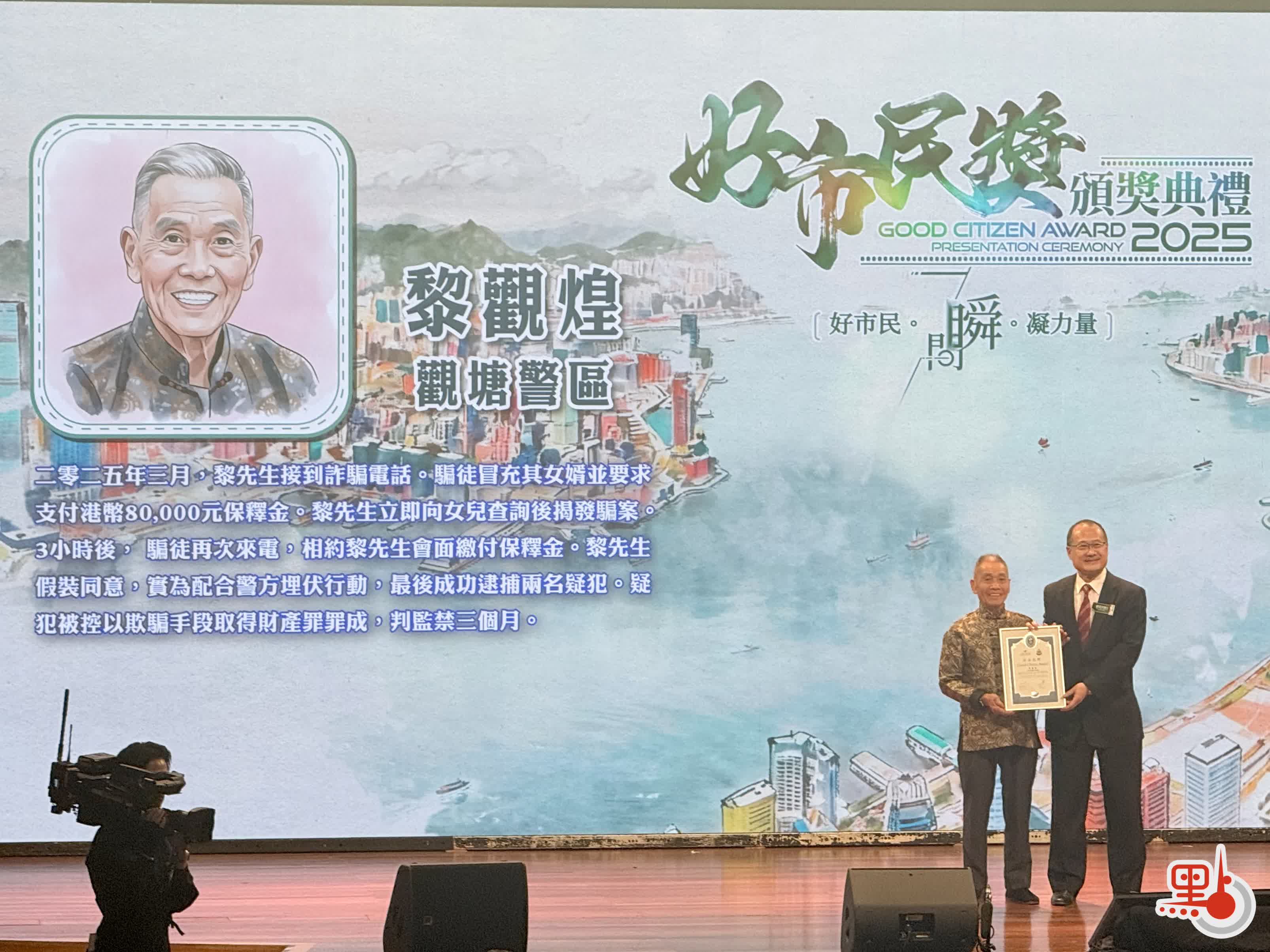 【點新聞報道】「好市民獎頒獎典禮2025」今日(14日)假會展中心舉行,嘉許80名協助警方撲滅罪行的好市民,並表揚協助警方推動防騙滅罪工作的6間機構。