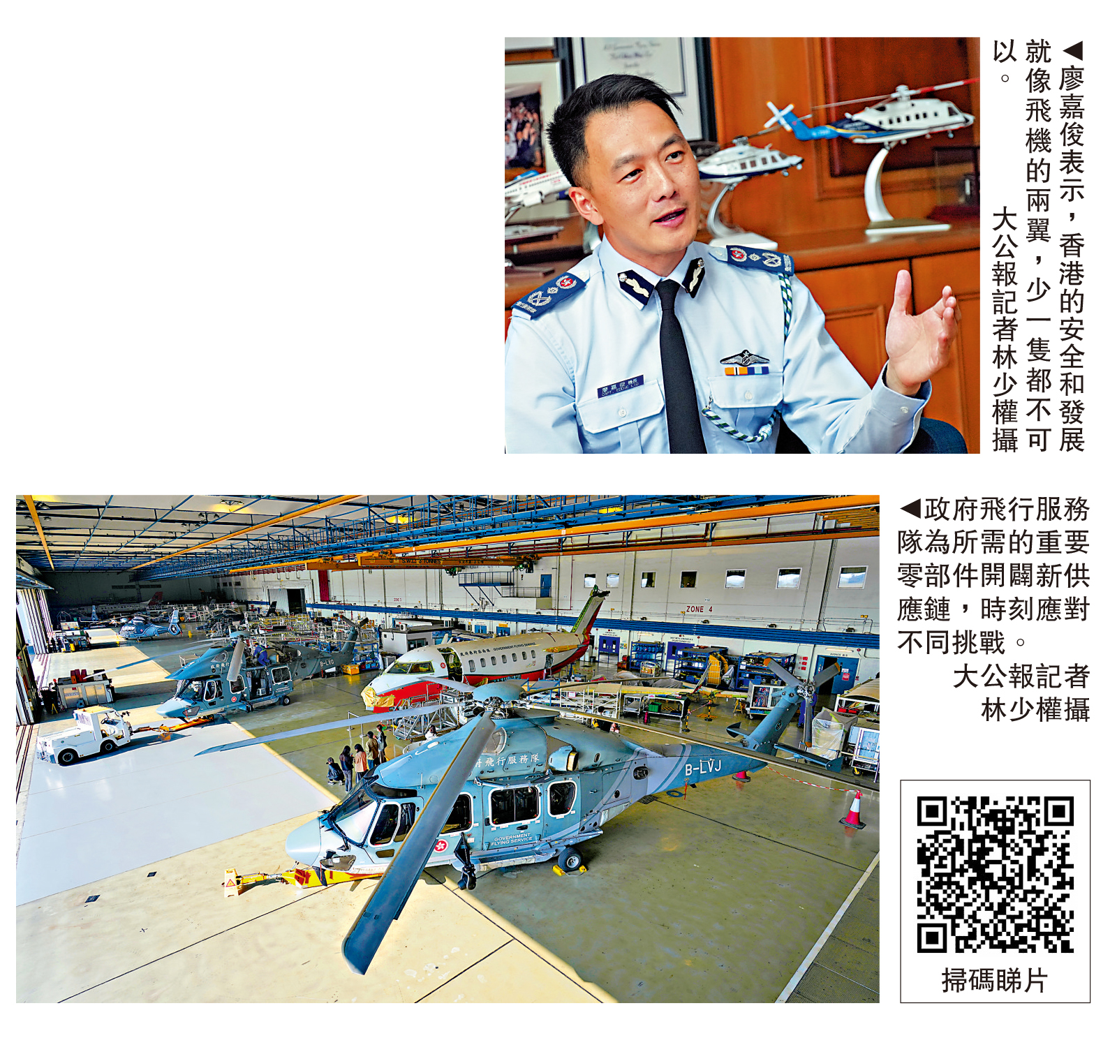 今年是國安法公布實施六周年,作為特區政府紀律部隊之一、政府飛行服務隊隨時候命,透過緊急服務和定期空中監測,確保香港這個家園在各種威脅面前都能夠保持穩定繁榮。政府飛行服務隊總監廖嘉俊接受大公文匯傳媒集團專訪時表示,「安全和發展,就像飛機的兩隻翼,少一隻都不可以。」為了應對未來挑戰,部門會繼續「以高水平安全護航『一國兩制』事業高質量發展」。
