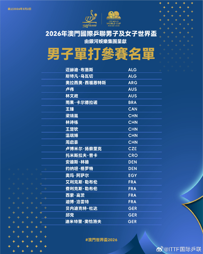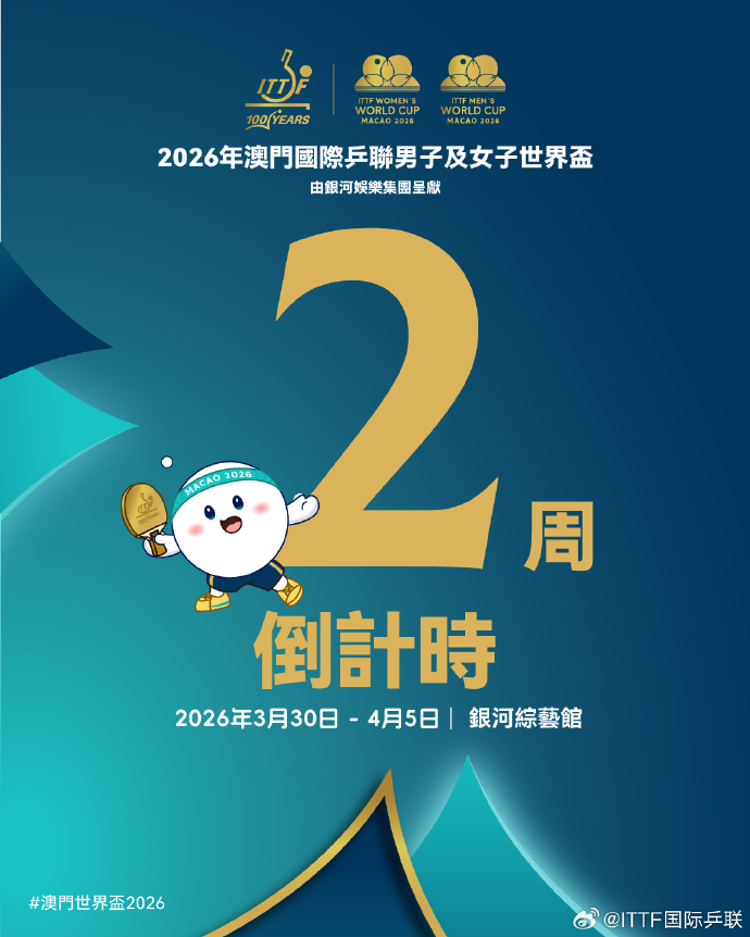 【點新聞報道】2026年國際乒聯男子、女子單打世界盃將於3月30日至4月5日在中國澳門舉行,屆時將有48名運動員進行角逐。