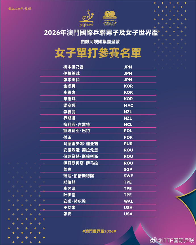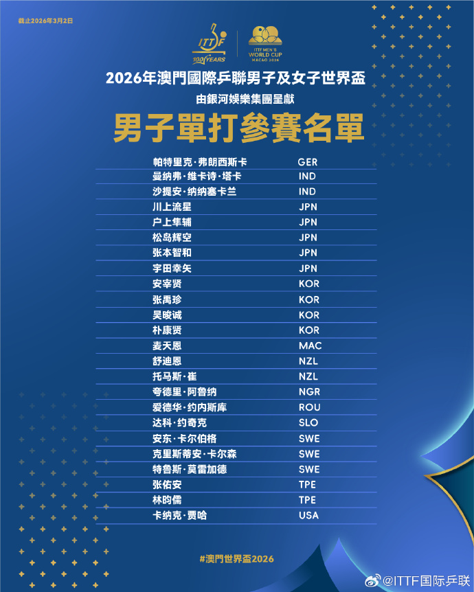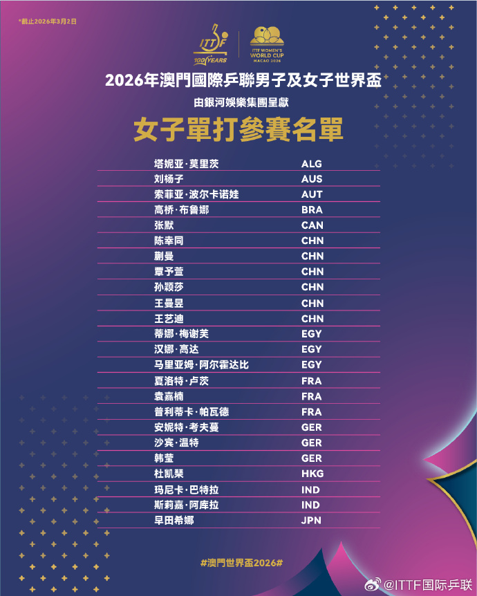 ITTF澳門世界盃3·30開鑼 孫穎莎王楚欽林詩棟出戰