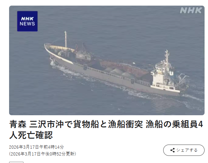 【點新聞報道】據日媒引述日本八戶海上保安部報道,當地時間3月17日凌晨,青森縣三澤市附近海域發生的船隻相撞事故中,漁船上的13人已被全部找到,其中4人已確認死亡,其餘9人沒有生命危險。