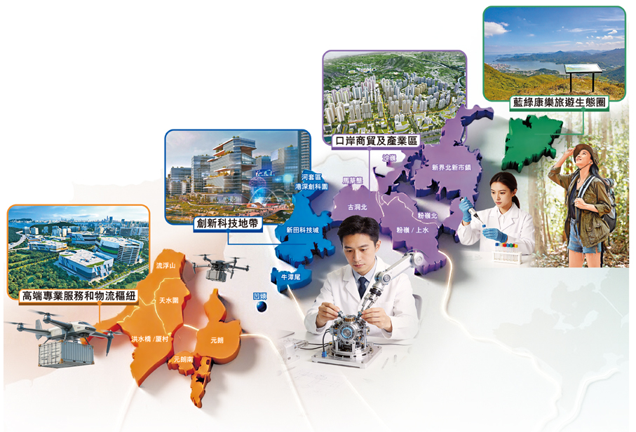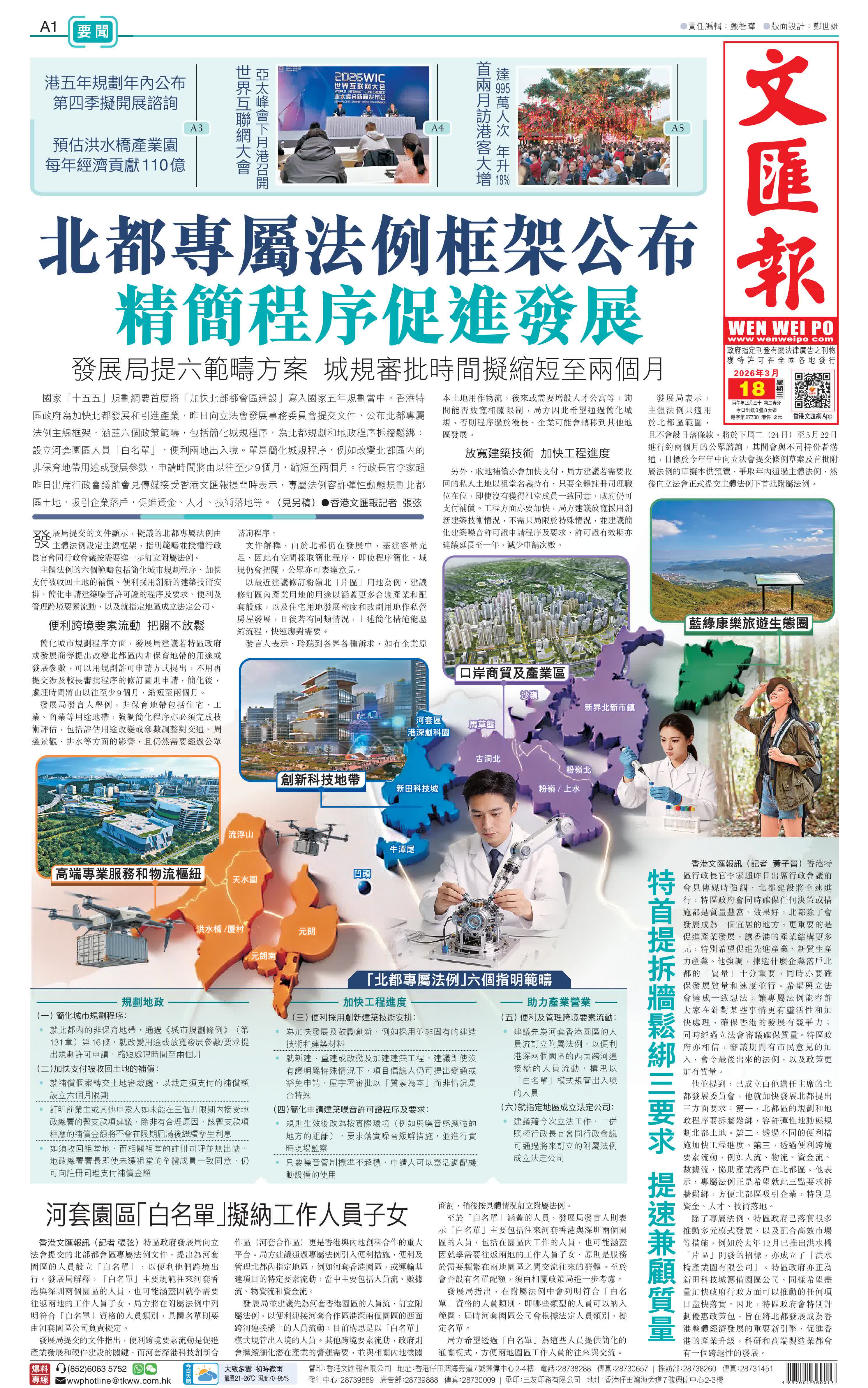 國家「十五五」規劃綱要首度將「加快北部都會區建設」寫入國家五年規劃當中。香港特區政府為加快北都發展和引進產業,昨日向立法會發展事務委員會提交文件,公布北都專屬法例主線框架,涵蓋六個政策範疇,包括簡化城規程序,為北都規劃和地政程序拆牆鬆綁;設立河套園區人員「白名單」,便利兩地出入境。單是簡化城規程序,例如改變北都區內的非保育地帶用途或發展參數,申請時間將由以往至少9個月,縮短至兩個月。行政長官李家超昨日出席行政會議前會見傳媒接受香港文匯報提問時表示,專屬法例容許彈性動態規劃北都區土地,吸引企業落戶,促進資金、人才、技術落地等。