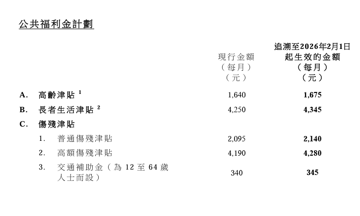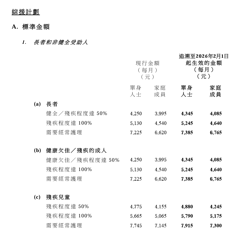 【點新聞報道】社會福利署今日(18日)公布,綜合社會保障援助(綜援)計劃的標準項目金額,以及公共福利金計劃(即高齡津貼、長者生活津貼和傷殘津貼)津貼金額的按年調整,會追溯至今年2月1日起生效。
