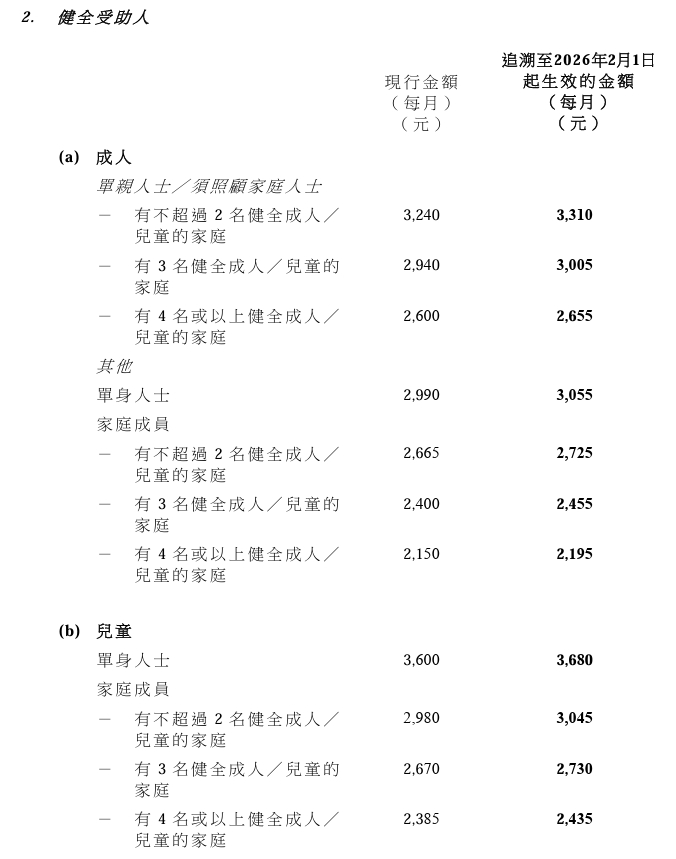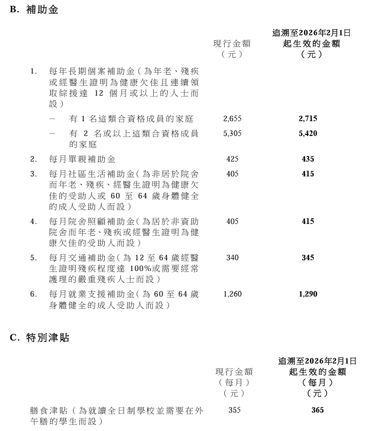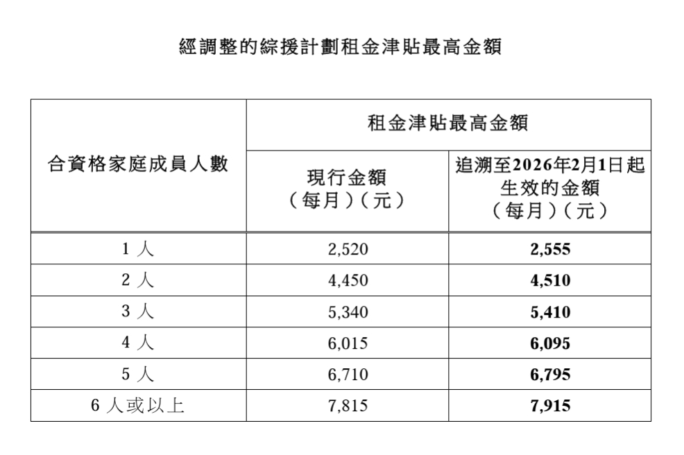 此外,政府根據甲類消費物價指數中私人房屋租金指數的變動,上調綜援計劃租金津貼最高金額1.3%,並同樣追溯至今年2月1日起生效。」