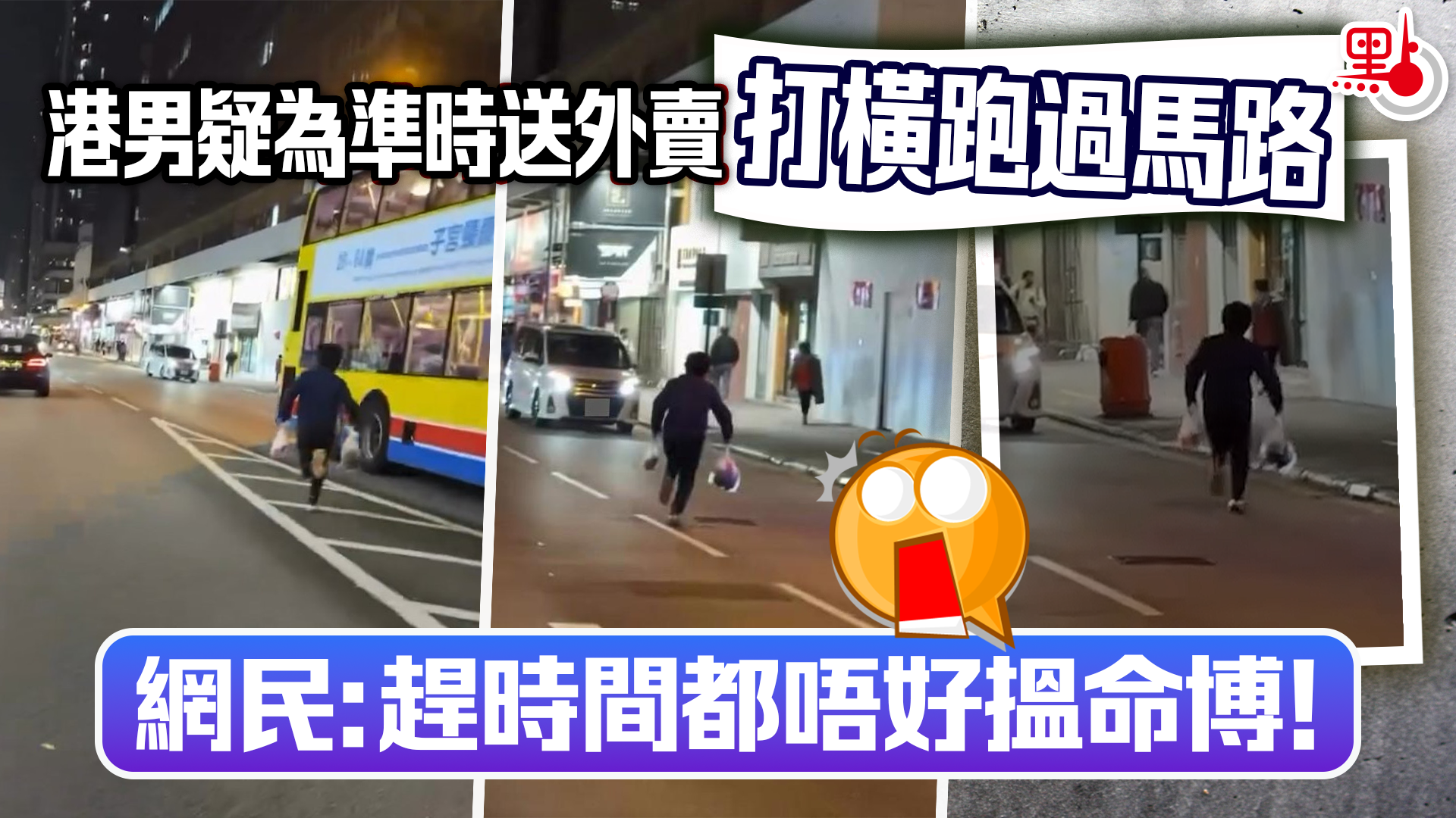 從網上影片所見,一名身穿黑色長袖上衣的男子雙手各提着一包外賣食物,打斜橫着飛奔至對面行人路上,其間有一輛巴士駛過男子身邊,雙方距離十分近,場面驚險。