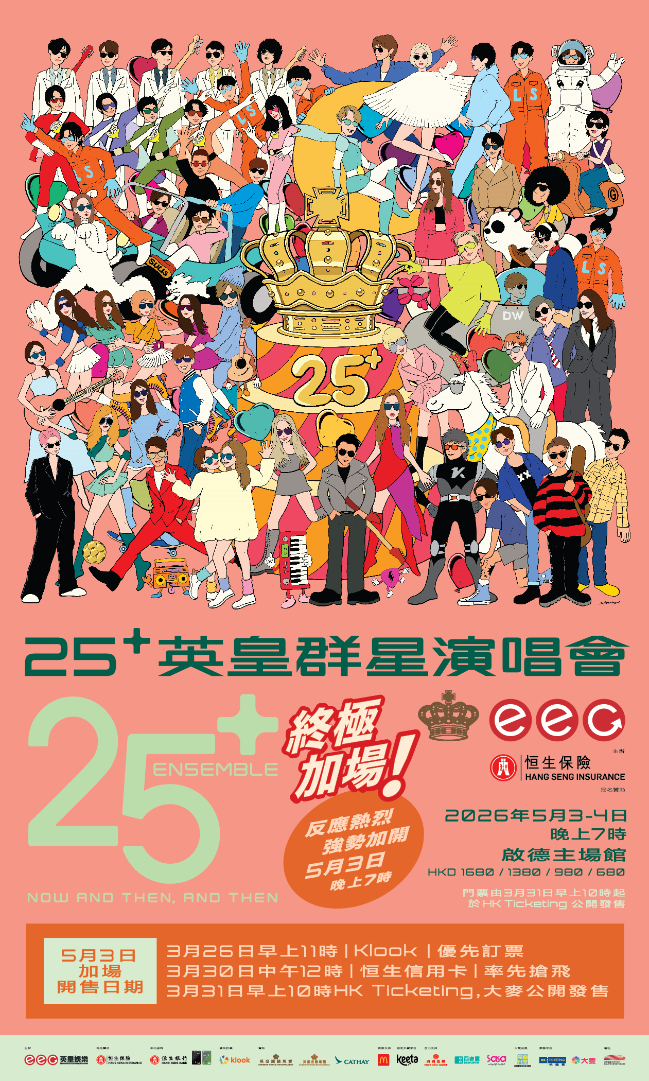 【點新聞報道】「25+英皇群星演唱會」自公布以來反應熱烈,5月4日場次火速售罄。為回饋一眾樂迷支持,大會今日(19日)驚喜宣布終極加開5月3日最後一場,機會難得,不再加場!加場門票將於3月26日上午11時於Klook優先訂票平台開售,3月30日中午12時開放恒生信用卡優先搶飛,並於3月31日上午10時正式公開發售。