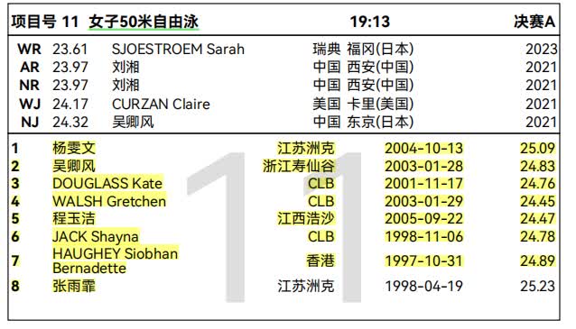 在今晚率先進行的50米「飛魚大戰」中,美國游泳名將沃爾什(WALSH Gretchen)憑藉恐怖的出發和水下腿技術,是奪冠最大熱門;澳大利亞名將傑克(JACK Shayna)則以扎實的途中游能力著稱,具備後程絕殺的實力。美國全能戰士道格拉斯(DOUGLASS Kate)同樣擁有頂尖的細節技術。此外,由國家隊奧運冠軍張雨霏領銜,吳卿風、楊雯文、程玉潔等一眾國家隊知名泳將,必將藉助主場優勢掀起一波快節奏的衝擊。