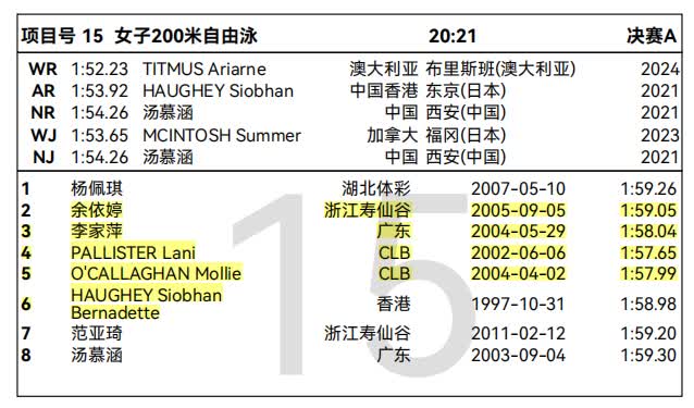 作為女子100米、200米自由泳的亞洲紀錄保持者,200米自由泳是何詩蓓的絕對主項,她在去年的全運會賽場上也曾在該項目奪金。雖然她在昨日賽後表示,亞運會才是今年下半年的主要目標,目前並不太在意具體的完賽時間。但從昨日100米決賽力克強敵的表現來看,她的狀態正處在穩步回升中。