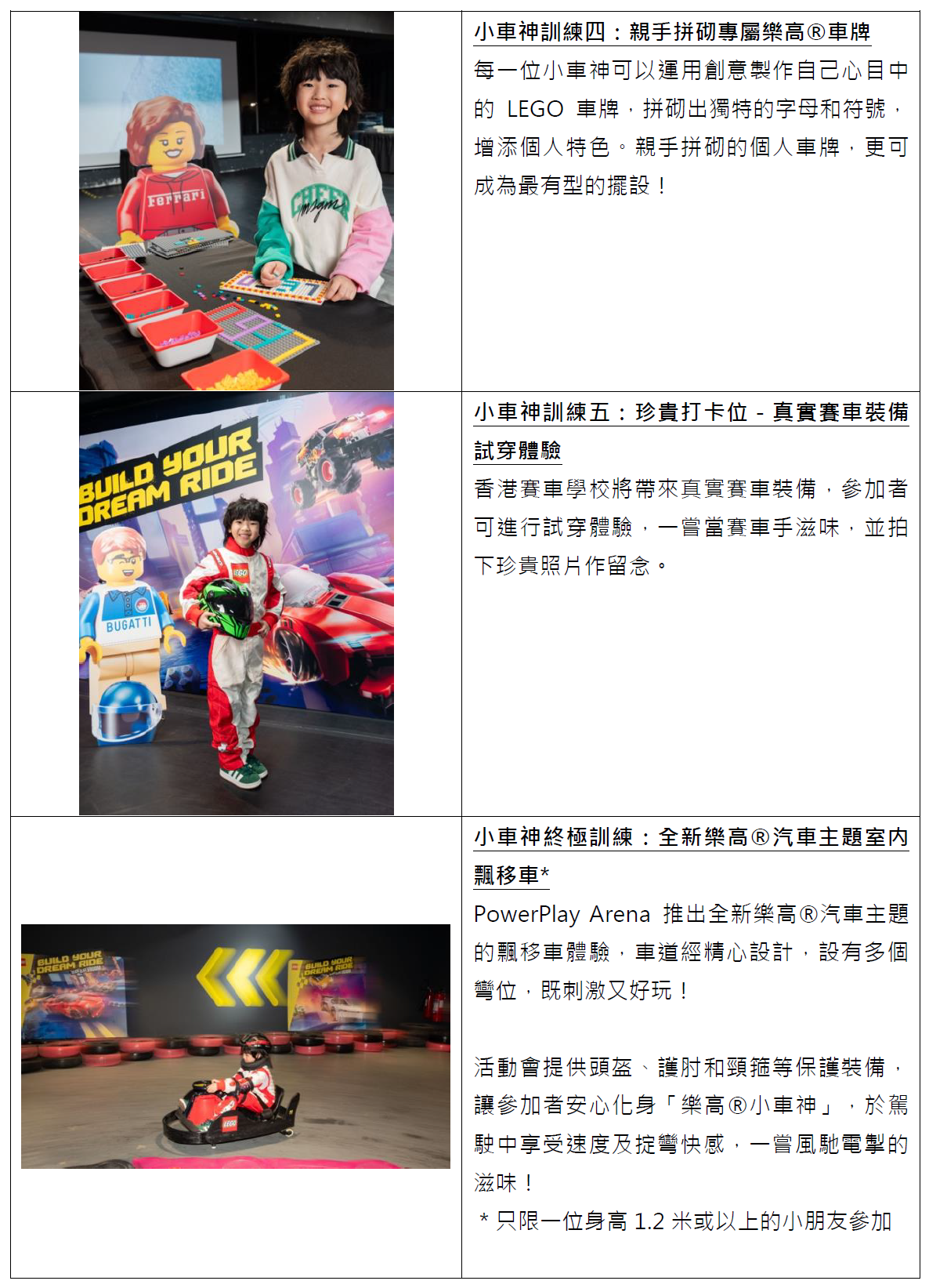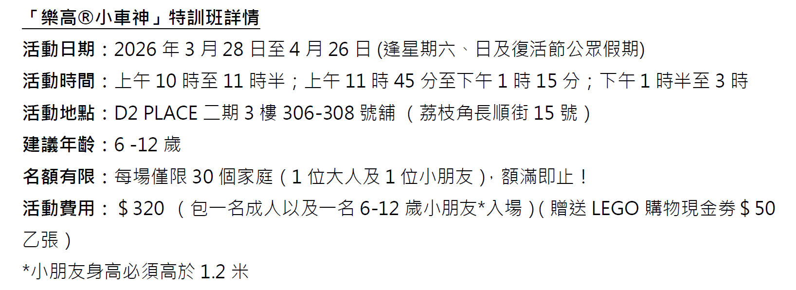 LEGO香港聯同香港賽車學校及室內飄移車遊樂場PowerPlay Arena,攜手推出全港首個「樂高小車神」特訓班,於3月28日至4月26日隆重舉行!特訓班專為6至12歲熱愛汽車與駕駛的小車手而設,讓孩子在拼砌、學習與體驗中,盡情探索汽車的奧秘。六大訓練讓小車手了解汽車原理及體驗汽車世界:包括樂高小小汽車工程師劇場、拉力車大挑戰、樂高遙控車駕駛體驗、親手拼砌專屬樂高車牌、真實賽車裝備試穿體驗及全新樂高汽車主題室內飄移車。每位完成特訓班的小車手,會獲頒發「樂高小車神」證書,以及贈送LEGO 50蚊現金券乙張。