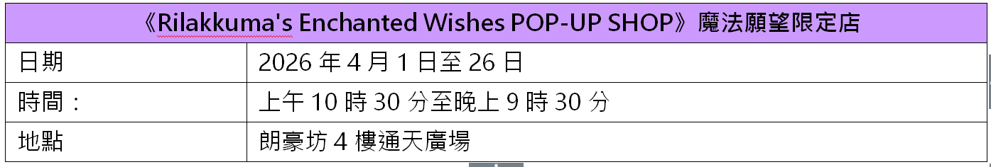 同場期間限定商店更將推出逾30款全球首發「Rilakkuma's Enchanted Wishes」主題限量精品及逾200款日版原創新品,並以全港唯一據點搶先曝光,讓粉絲將夢幻時光延續至日常生活中。