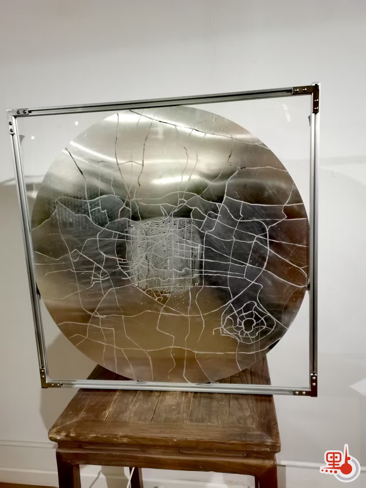 作為土生土長的香港人,羅嘉豪創作的溫感混合媒體裝置《攢》思考粵港文化的同根同源。作品以銅錢作為外形,通過溫感油墨繪出廣州地圖,而中間區域則在溫度的影響下蒸出水珠,「廣州是海上絲綢之路的起點,而水珠即代表來此交流、建設者們辛勤的汗水,也是香港承傳的文化根源所在。」他另一件作品是一段香港城市影像的視頻,是他將所拍攝到的城市素材「餵」給AI所成,「AI可以成為藝術創作之輔助,但人在運用它的時候,也要把控好度,不可以讓作品過於抽象。」