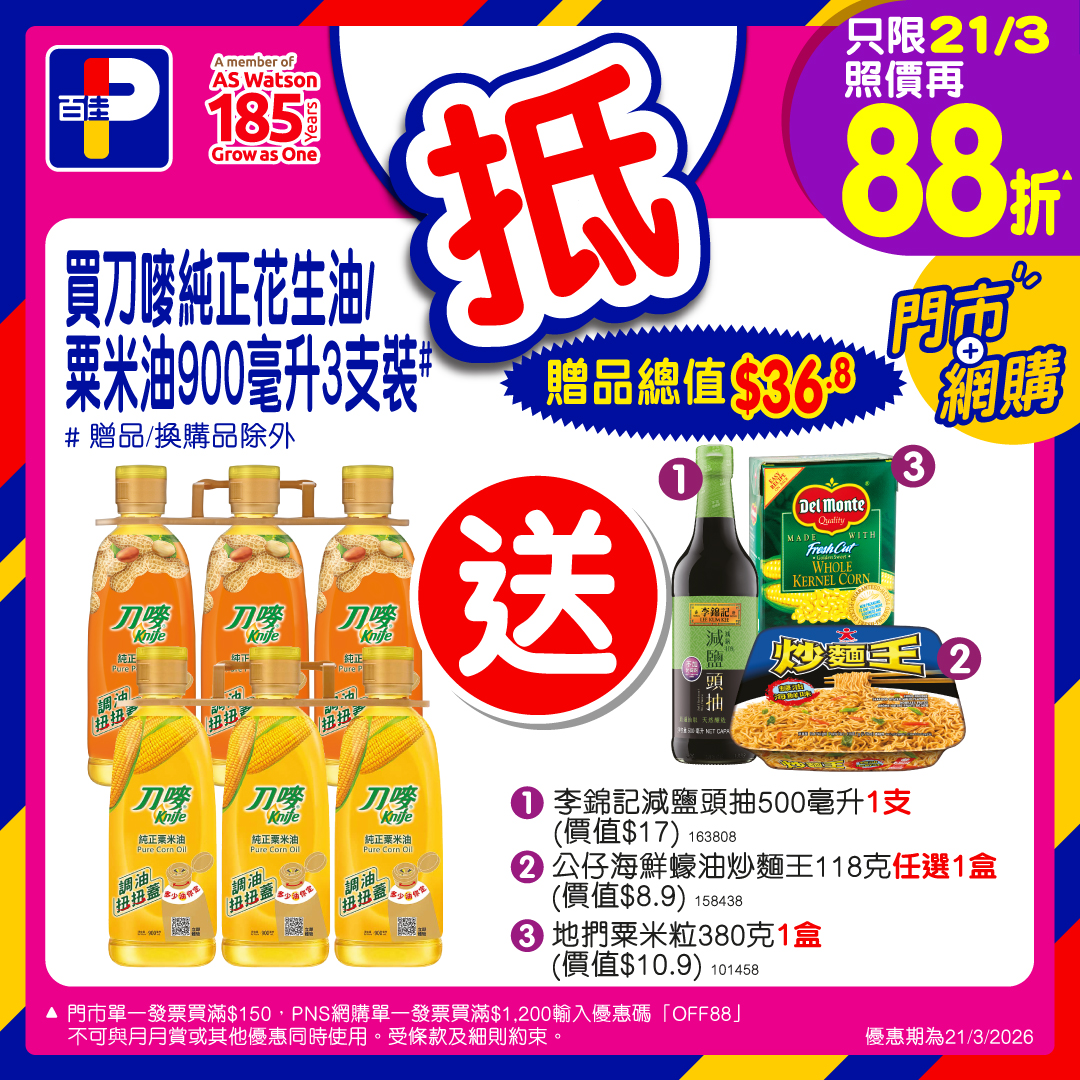 3月20日至26日期間,任選5款精選碗麵還能享額外77折,可與3月21日門市買滿$168「全場88折」快閃優惠同步使用,實行折上再折!優惠期內貨品種類包羅萬有,把握時機來掃貨吧!