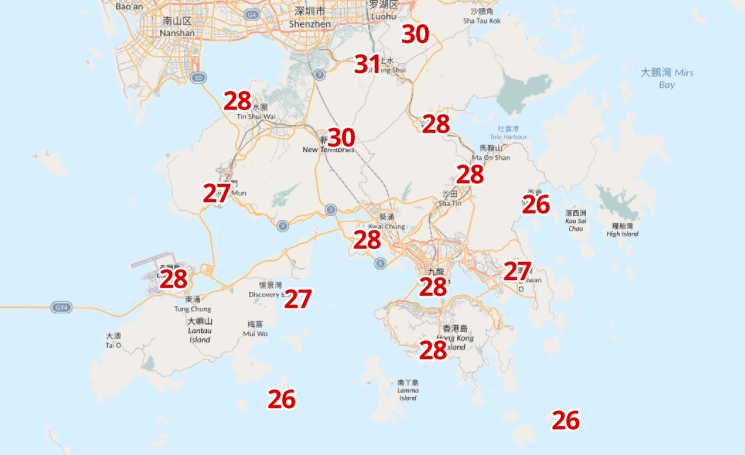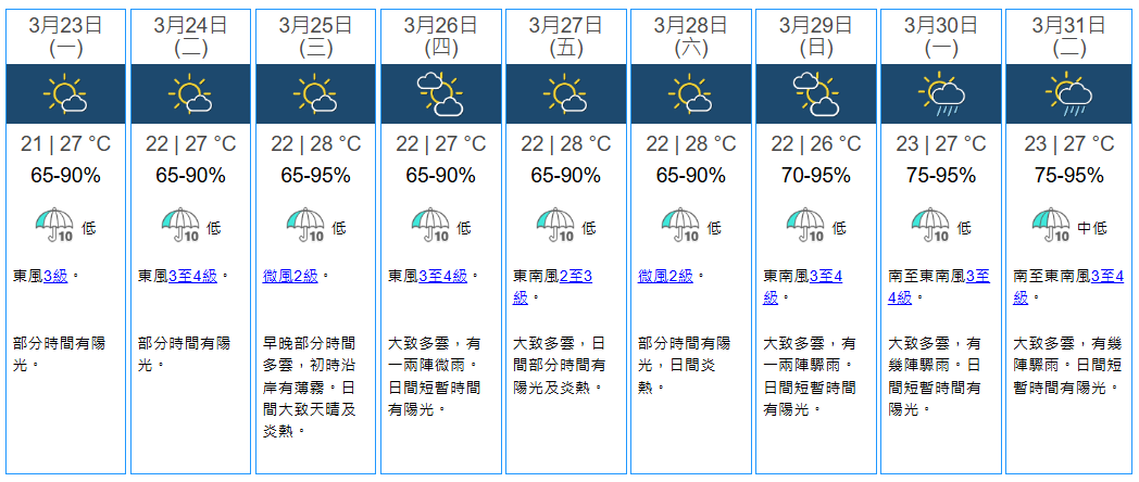 根據天文台九天天氣預報,明後兩日(3月23日及24日)日間部分時間有陽光,氣溫介乎21度至27度,上水地區最高氣溫可達30度。到周三(3月25日)早晚部分時間多雲,初時沿岸有薄霧,日間大致天晴及炎熱。天文台自動分區天氣預報亦顯示,上水、打鼓嶺、錦田等多區最高氣溫可達30度或以上。