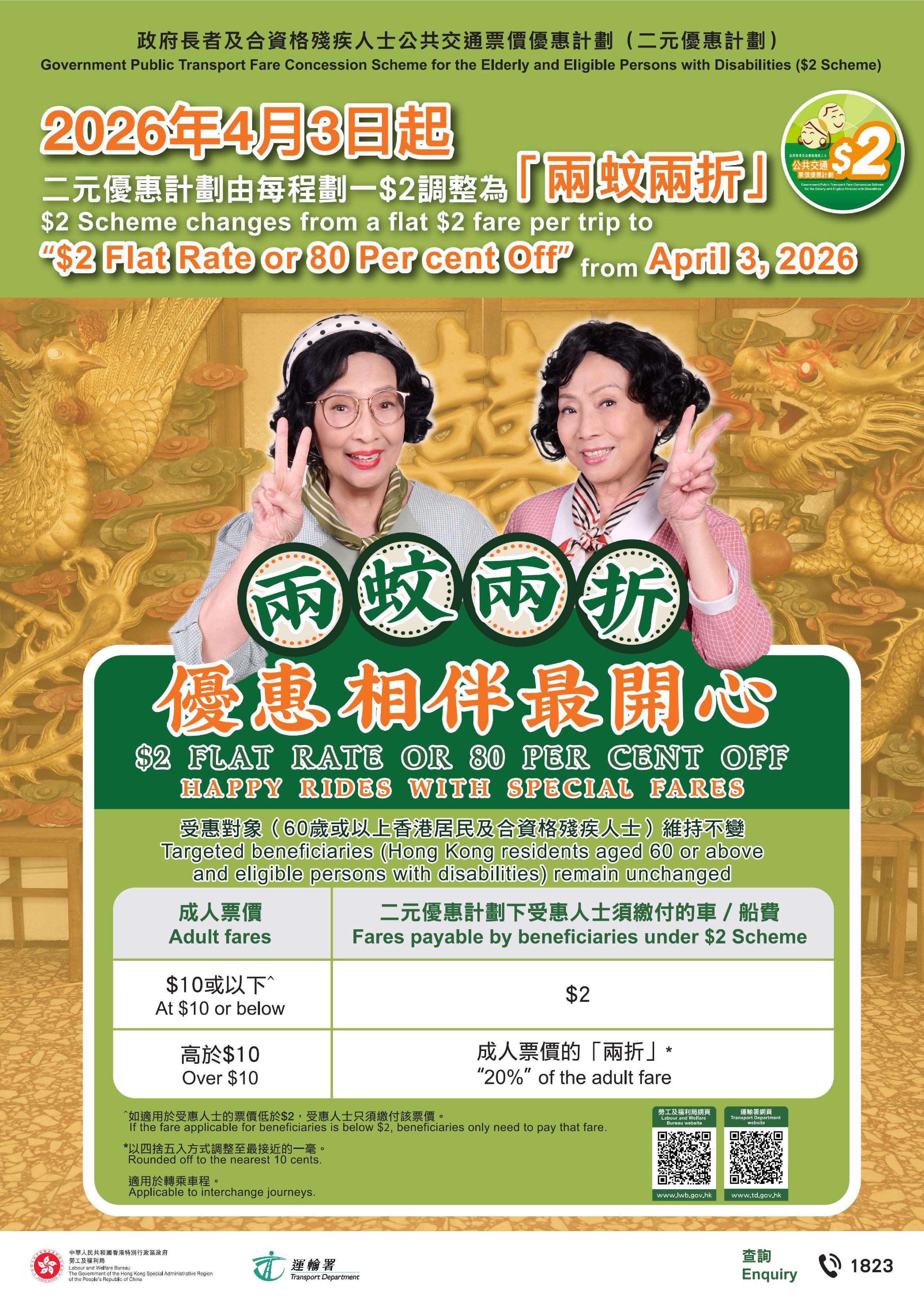 政府將會推出一系列宣傳,讓合資格受惠人士了解「兩蚊兩折」安排,包括推出電視宣傳短片及電台廣播、於主要公共交通網絡及為長者和殘疾人士提供服務的地區網絡張貼宣傳海報及派發宣傳單張、在公共交通工具展示廣告。勞福局今日也為全港18區區議會議員和地區服務及關愛隊伍舉行兩場簡報會,講解「兩蚊兩折」安排,以便他們協助向二元優惠計劃的受惠人士宣傳和解答查詢。此外,政府更會於「兩蚊兩折」調整生效日起,在港鐵站和公共交通交匯處等派駐服務大使協助市民及解答查詢。