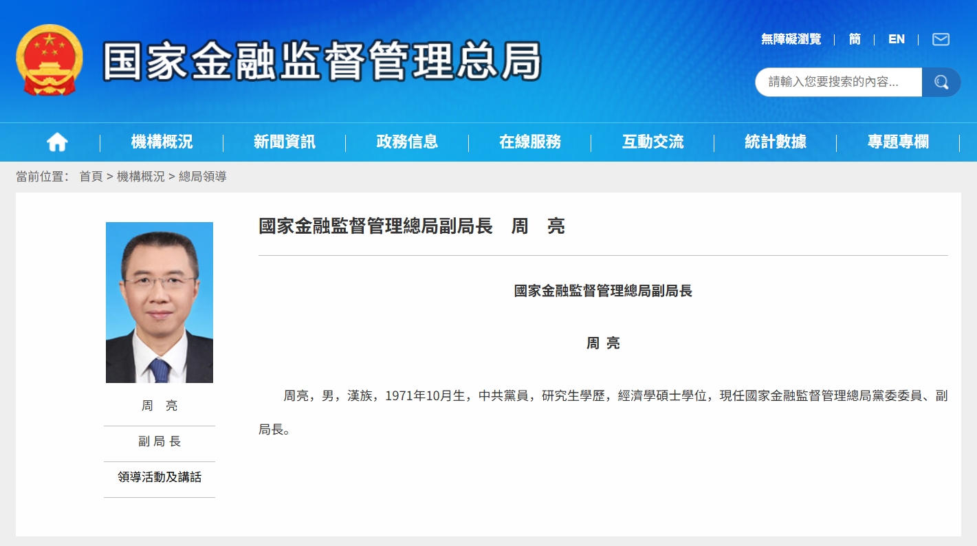 公開簡歷顯示,周亮,男,漢族,1971年10月生,中共黨員,研究生學歷,經濟學碩士學位,現任國家金融監督管理總局黨委委員、副局長。