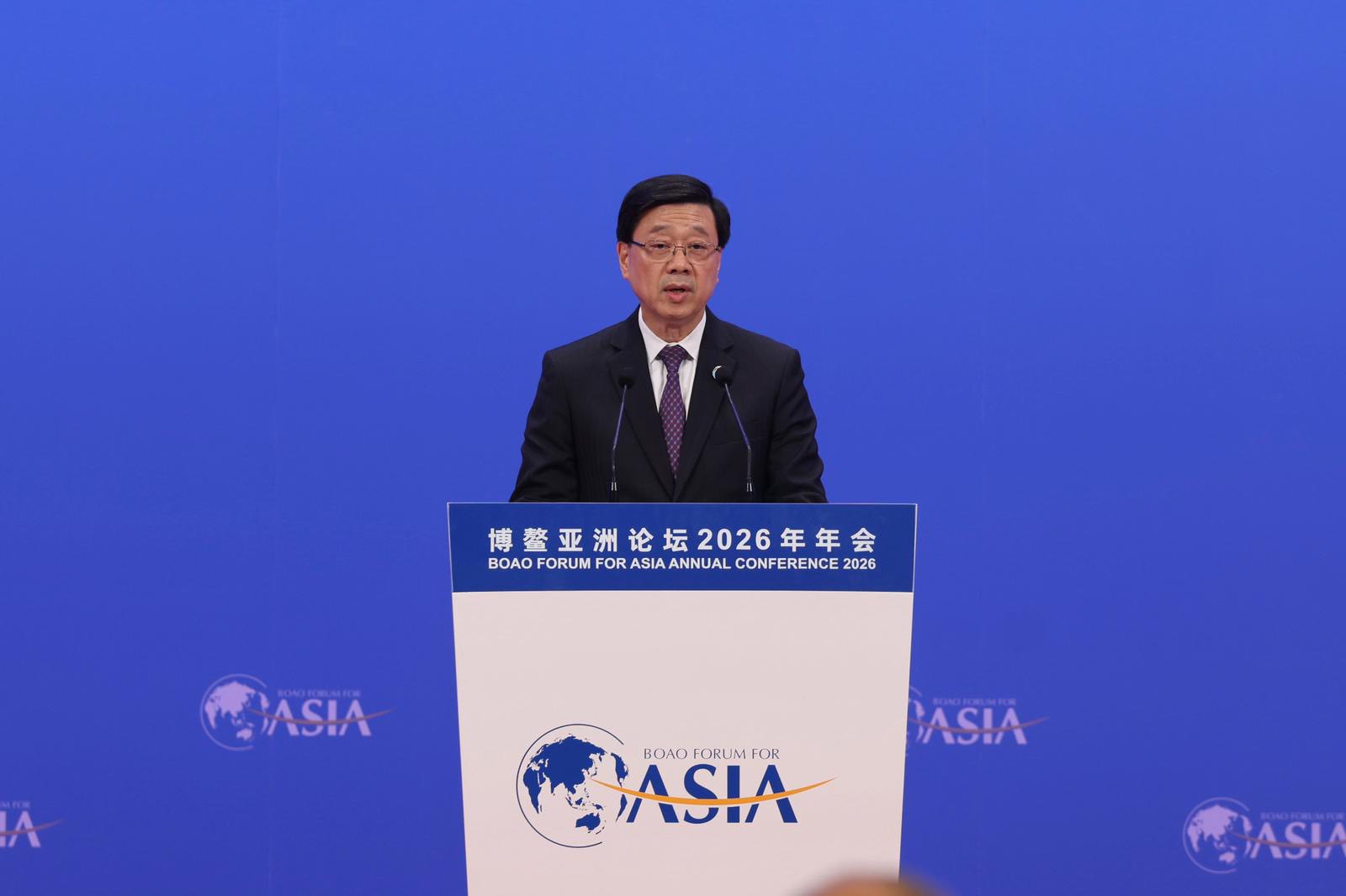 李家超在論壇上致辭時表示,今年是博鰲亞洲論壇成立25周年,論壇一直促進區域合作,已成為推動亞洲經濟合作的重要平台。今年是國家「十五五」規劃的開局之年,規劃全力支持海南自由貿易港實現高質量發展。他祝賀海南自貿港全島封關運作順利,多項便利企業發展的政策快速落地,是國家促進自由貿易、擴大高水平對外開放的重要實踐。他有信心,香港作為國際貿易中心,繼續與海南自由貿易港優勢互補、互惠共贏,共同為推動自由貿易貢獻力量。