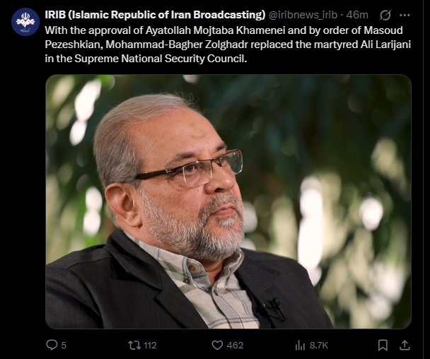 【點新聞報道】當地時間3月24日,伊朗總統辦公室通信與新聞副主任通過社交媒體平台發布消息表示,經最高領袖的意見與批准,並由總統下令,穆罕默德·巴吉爾·佐勒卡德爾已被任命為最高國家安全委員會秘書,接替上周在以軍空襲中遇害的拉里賈尼。