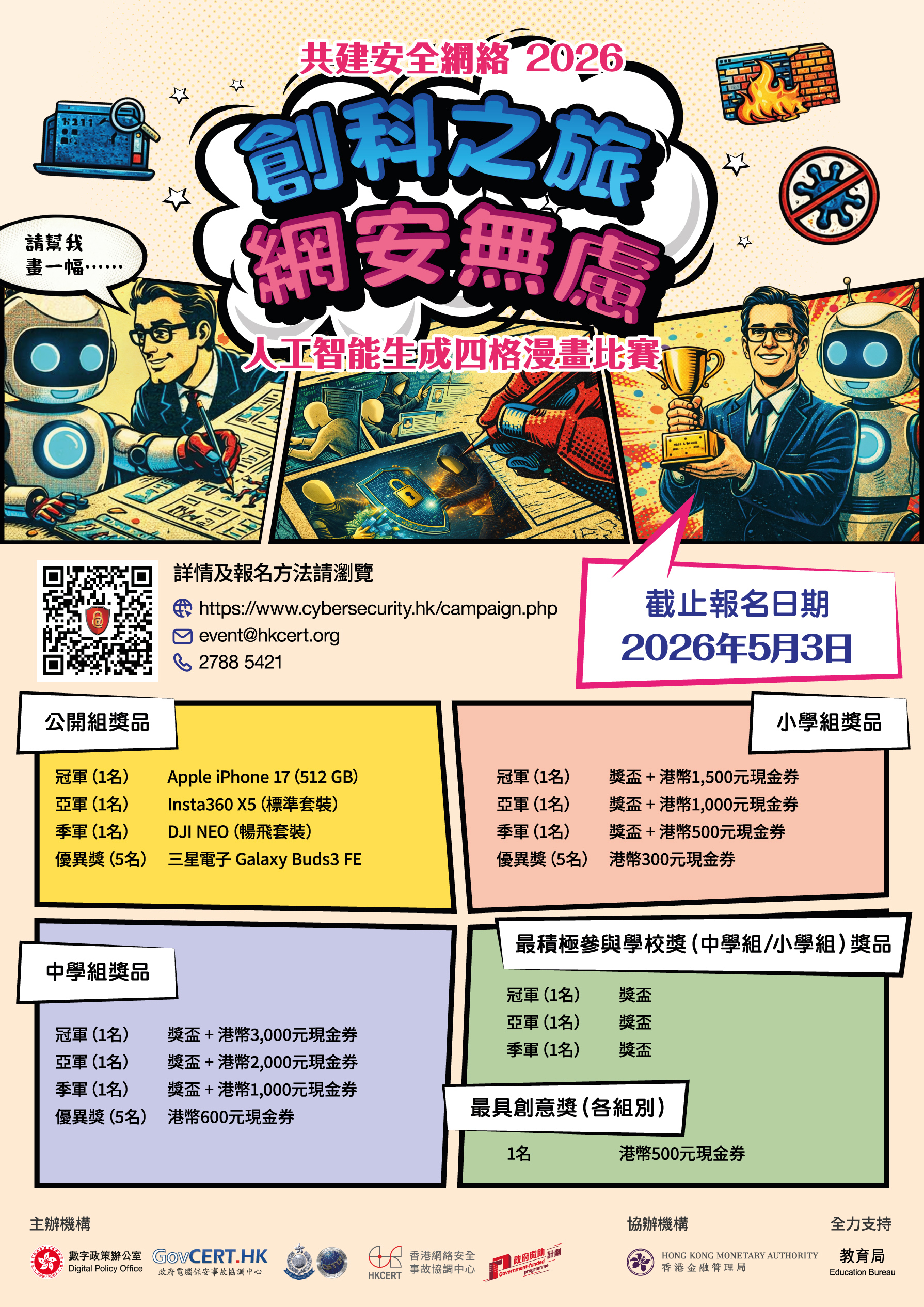 數字政策辦公室、香港警務處網絡安全及科技罪案調查科及香港網絡安全事故協調中心合辦「創科之旅 網安無慮」人工智能生成四格漫畫比賽。是次比賽旨在讓參賽者運用人工智能工具創作簡單易明的四格漫畫,宣傳網絡安全的重要訊息,讓市民大眾在輕鬆有趣的體驗中,提升對網絡威脅的警覺及防範意識。