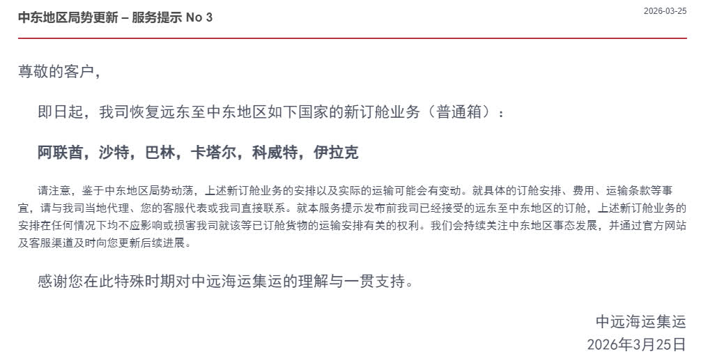 此前,中遠海運集運3月4日發布公告指,鑒於中東地區衝突持續升級,霍爾木茲海峽海上交通受到相應限制,因此決定暫停相關航線新訂艙業務。