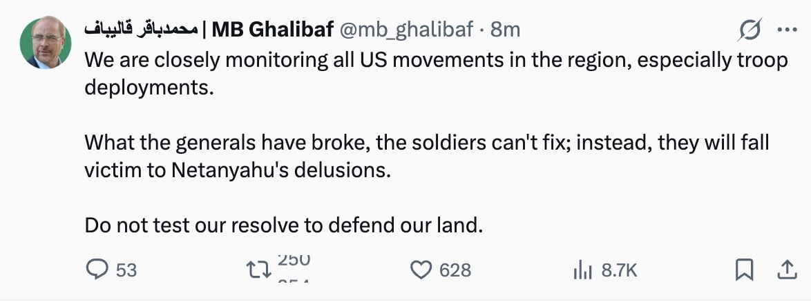 【點新聞報道】據央視新聞報道,當地時間25日,伊朗議會議長卡利巴夫在社交媒體發文稱,伊朗正密切監測美國在地區內的一切動向,特別是其部隊部署情況。