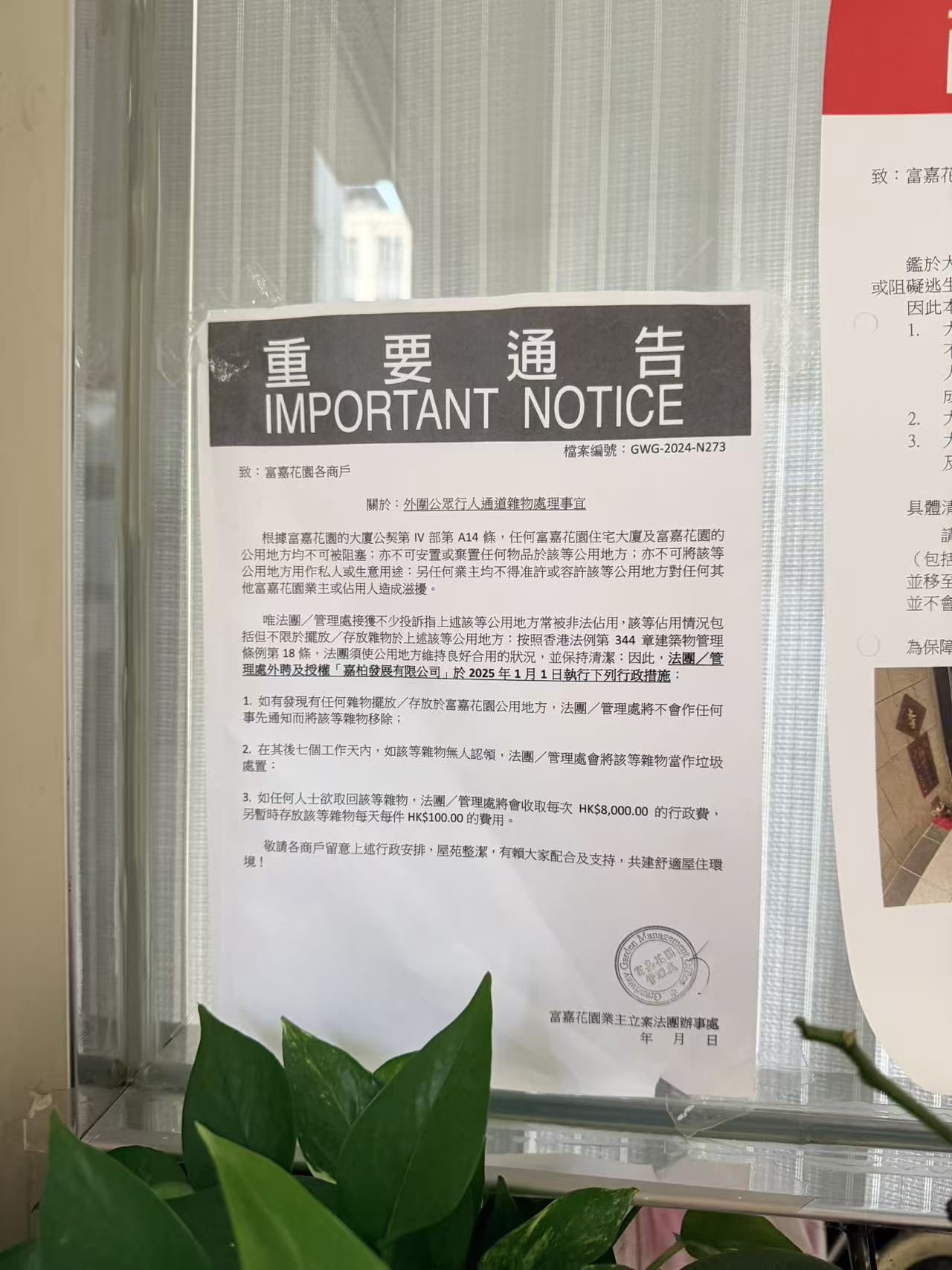 與管理處協商無果後,事主求助快遞公司,最終在屋苑的一間破舊倉庫找到包裹。雖然找回失物,但事主仍對事件感到困惑。「小區內沒有張貼通告,我們那棟樓的樓道、樓梯我都看過。」事主稱從未在公共區域見到任何有關「在走廊擺放物品屬違規、要繳8000港元」的提醒,有關通告僅貼在管理處辦公室內,住戶完全沒法得知有關要求。
