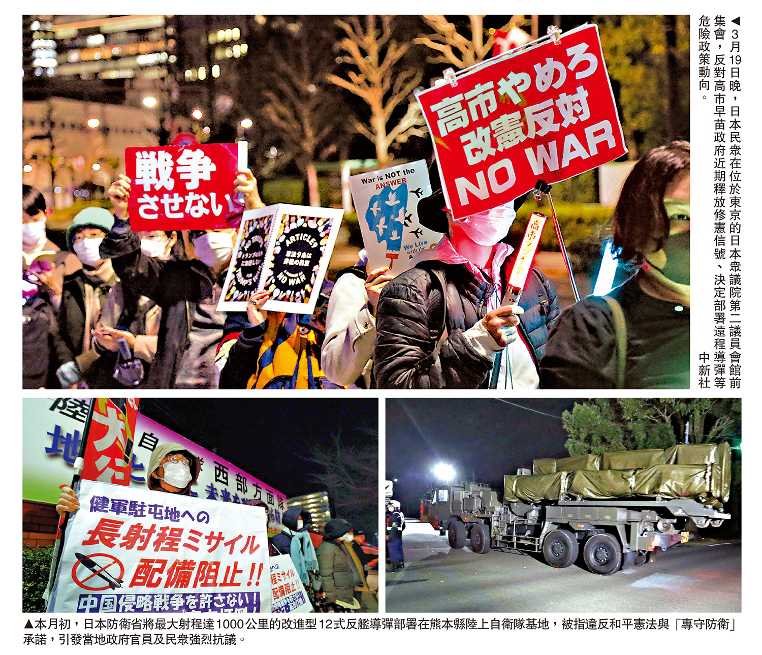 關於日本近期軍事動向,中國國防部發言人於3月11日表示,一段時間以來,日本右翼勢力加速推進「再軍事化」動作頻頻,推動修改「和平憲法」,加快修訂「安保三文件」,妄圖修改「無核三原則」。我們正告日方,窮兵黷武的老路是自取滅亡的不歸路。若日方膽敢武力侵犯中方主權安全,必將遭受迎頭痛擊和更加徹底的失敗。