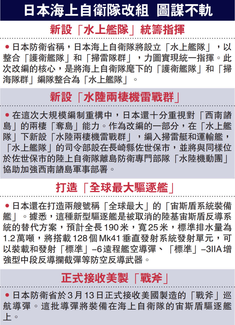 內地軍事專家邵永靈表示,日本海上自衛隊此次大幅改組真實意圖有三個方面。第一,就是突破專守防衛,轉向進攻性軍力。新增的「兩棲機雷戰群」,直接對接陸自水陸機動團,構建奪島、控島體系,徹底背離和平憲法約束。第二,是適配美日同盟,融入美軍戰區體系。此次編制改革對標美軍戰區聯合作戰,更便於海自與美軍協同指揮、聯合行動,深度嵌入「印太戰略」,強化美日在第一島鏈的威懾力。最後,它也是日本將中國視作最大戰略挑戰,在軍事上的體現。「水陸兩棲機雷戰群」司令部駐在佐世保,扼守西南海域,針對台海、東海與南海方向的意味非常明顯,意在打造對中國的前沿威懾與封鎖能力。