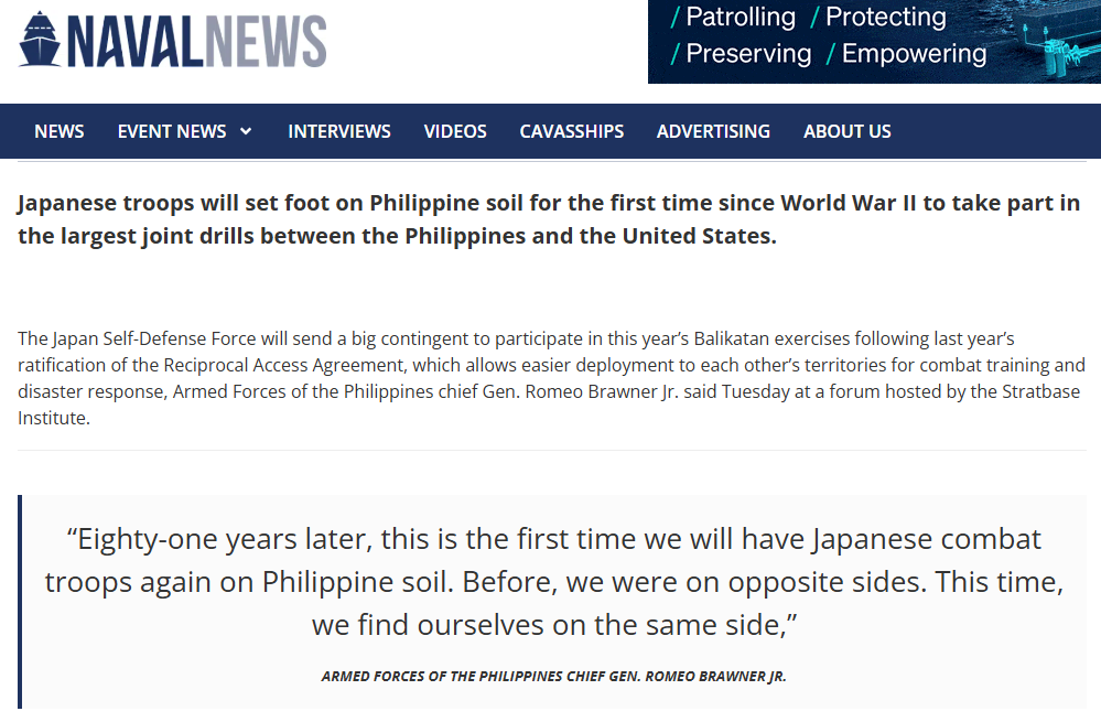 【點新聞報道】據環球時報援引法國「海軍新聞」網站24日報道,日本作戰人員將自二戰結束以來首次踏上菲律賓本土,參加菲律賓與美國之間最大規模的「肩並肩」聯合演習。