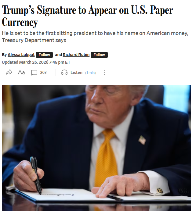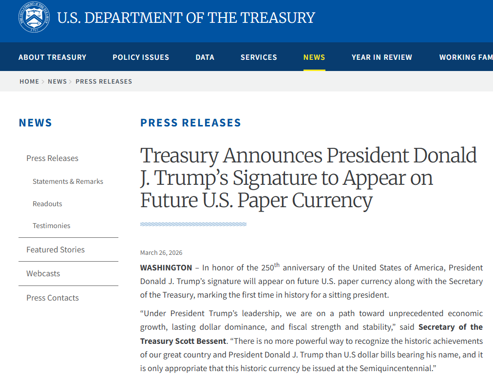 【點新聞報道】據CCTV國際時訊消息,美國財政部當地時間3月26日宣布,今年夏天起,美國紙幣上將開始出現總統特朗普的簽名。這將是美國現任總統首次在美鈔上簽名。