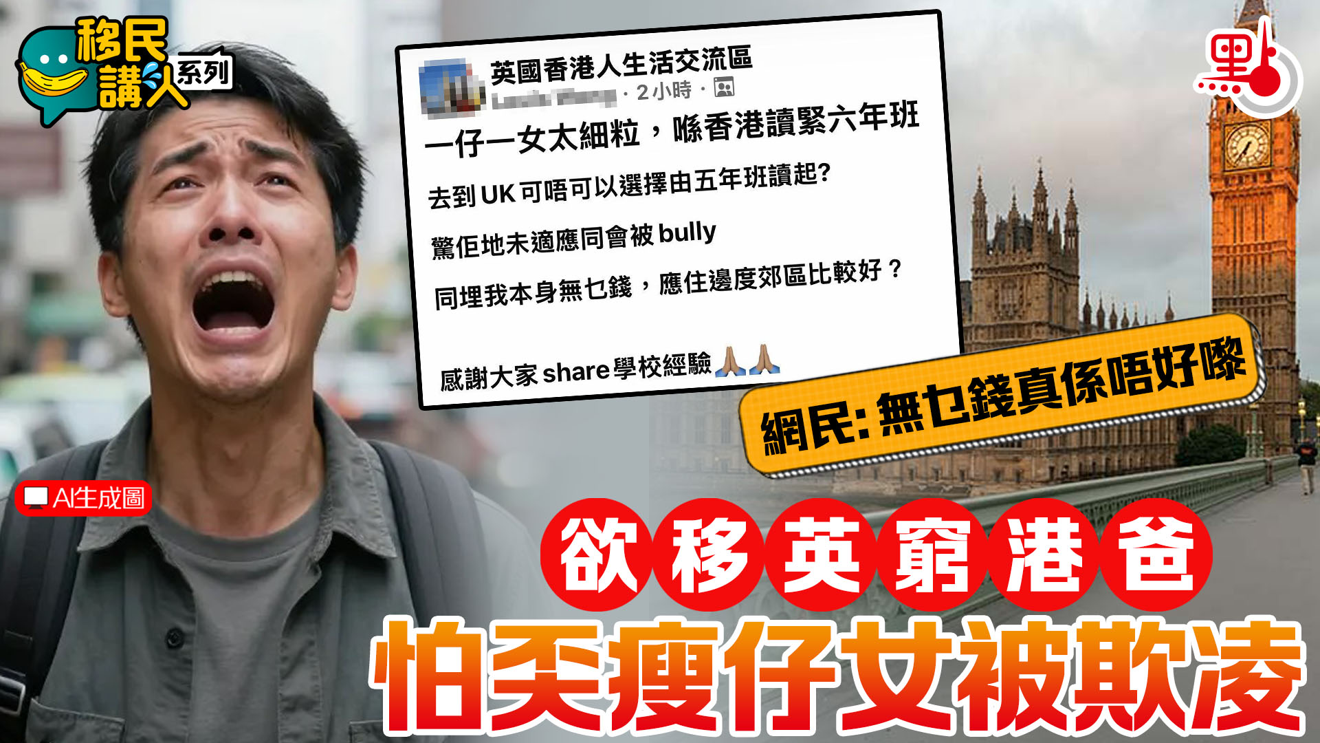 該名港爸在fb「英國香港人生活交流區」發文話,計劃攜同兩名子女移英,希望網民分享當地升學經驗,「一仔一女太細粒,喺香港讀緊六年班,去到UK可唔可以選擇由五年班讀起?驚佢哋未適應同會被bully同埋我本身無乜錢,應住邊度郊區比較好?」。