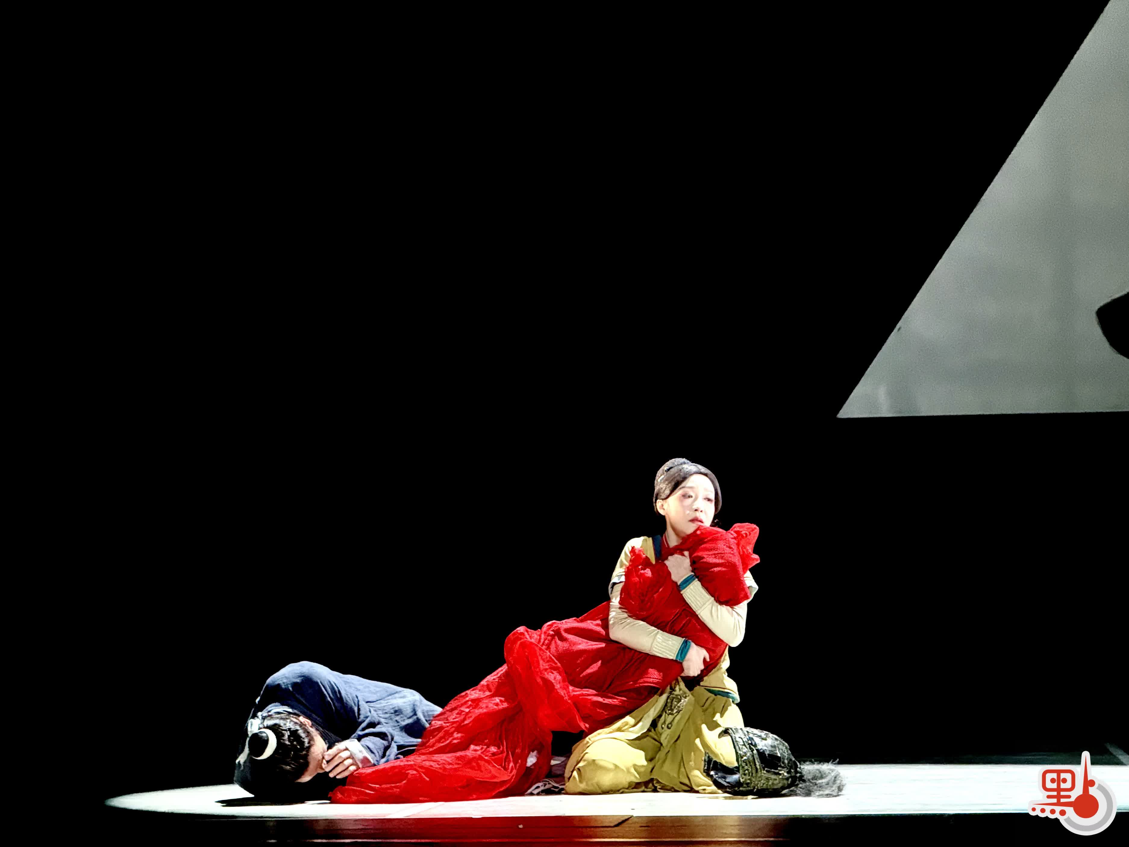 除劇情設計外,劇目還通過舞蹈、舞美及道具鋪排情感,幫助觀眾代入敘事。記者觀察到,舞台效果並不複雜,以黑、白、紅三色為主色調極簡寫意舞台,三色燈光的交替呈現正與邪、愛與恨、生與死的糾葛交織。台上反覆出現的道具包括線和燈籠,前者代表命運的連結與綑綁,後者象徵天人兩隔與冥冥中的指引,演員們運用這些元素串起全劇的時間線和故事線。
