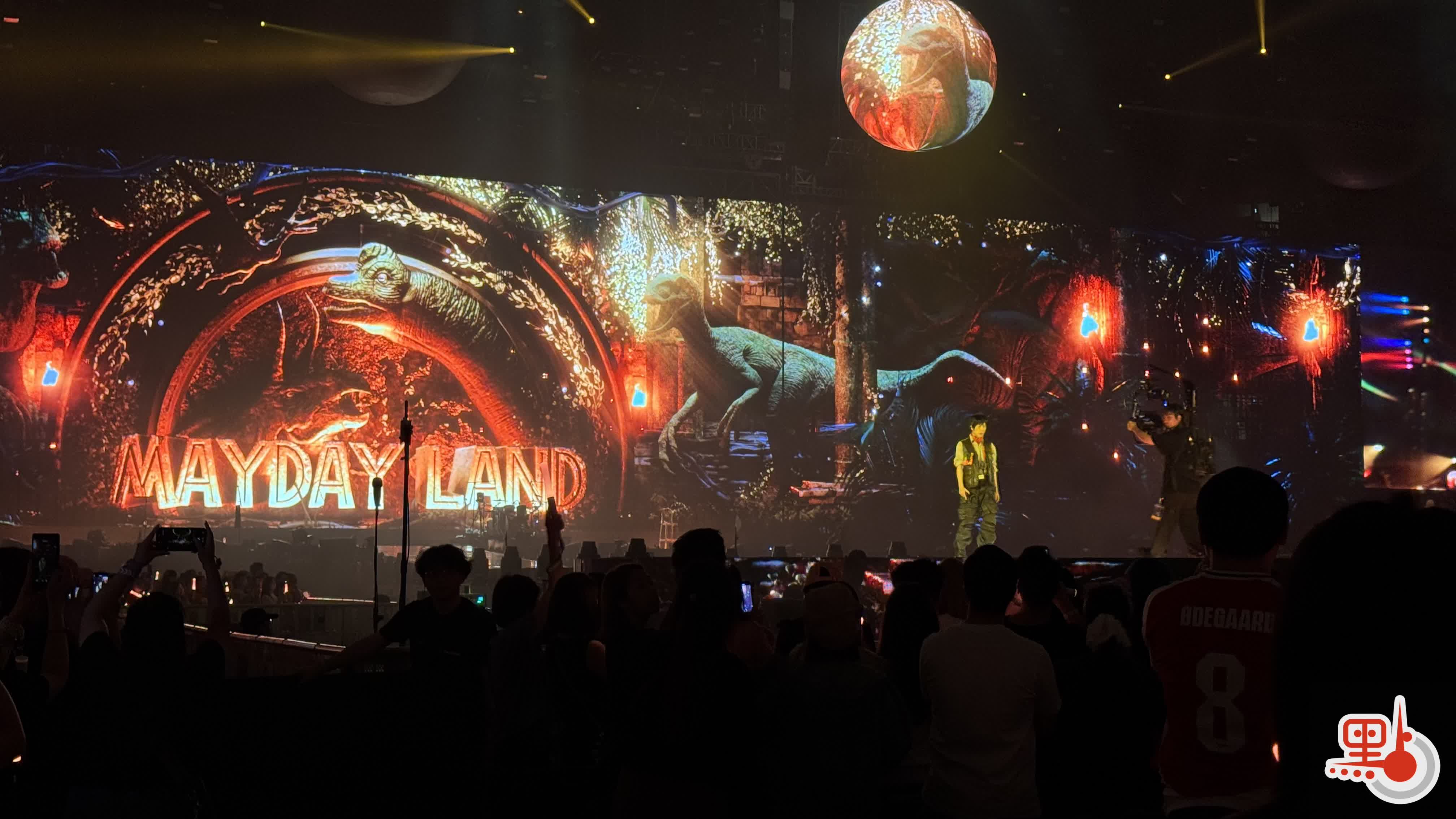 演唱會尾聲,五月天先後四度Encore,在《你不是真正的快樂》、《我不願讓你一個人》、《倔強》等歌曲後,現場歌迷大玩人浪,啟德主場館舞台瞬間幻化成一座壯觀的「MAYDAY LAND」,布景設計極具電影感,就在全場「五迷」還沉浸在視覺震撼之時,數米高的恐龍逐一緩緩現身,將現場一秒拉進電影《侏羅紀公園》的原始叢林之中。這些栩栩如生的巨型機械恐龍,踩着節拍與樂隊同台搖滾,隨着《最好的一天》、《傷心的人別聽慢歌》、《第一天》等經典旋律搖頭擺尾、張嘴律動,彷彿真的被音樂喚醒,成為舞台上最搶眼的「特別嘉賓」。