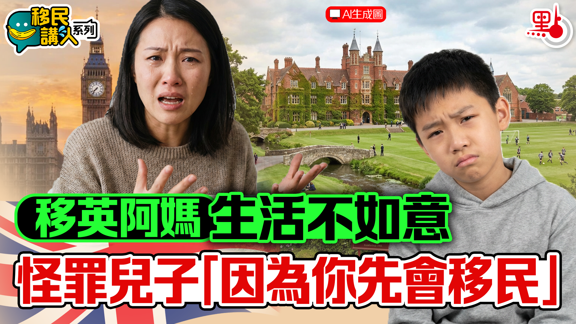 【點新聞報道】有移民英國的港媽當初搵子女做擋箭牌,聲言移民是為了子女將來着想,結果在當地生活不如意,就怪罪在兒子身上,話「因為你先會移民」,令兒子十分無奈。