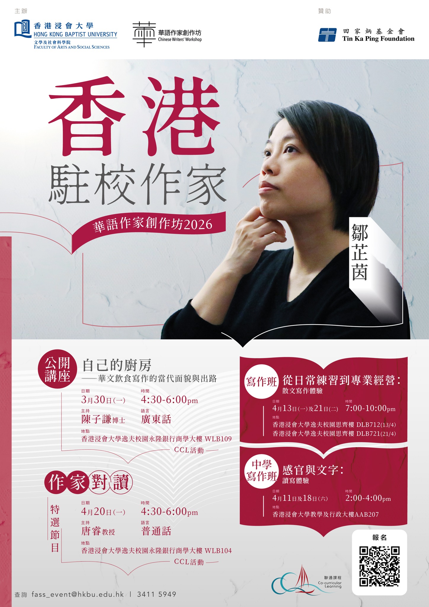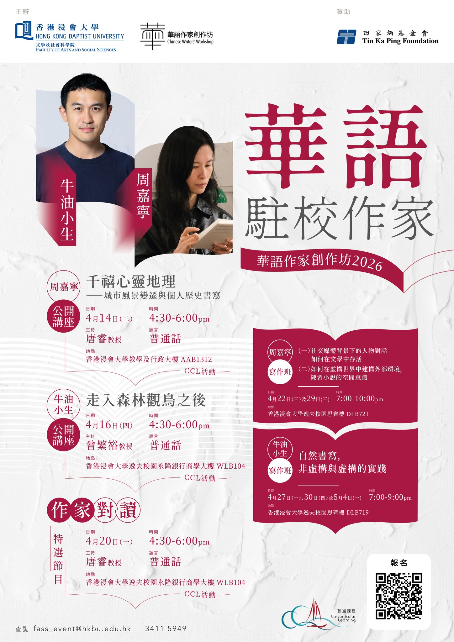 【點新聞報道】香港浸會大學(浸大)文學及社會科學院旗下的「華語作家創作坊」(創作坊),於3月30日至5月4日期間舉行第六屆「華語駐校作家計劃」及「香港駐校作家計劃」活動。兩項計劃邀得中國作家周嘉寧、馬來西亞作家牛油小生(陳宇昕),以及中國香港作家鄒芷茵博士駐校,他們於浸大參與作家對讀、個人講座及主持寫作班等多項活動,與廣大讀者交流文學及寫作心得。各項活動均免費開放予公眾參與。